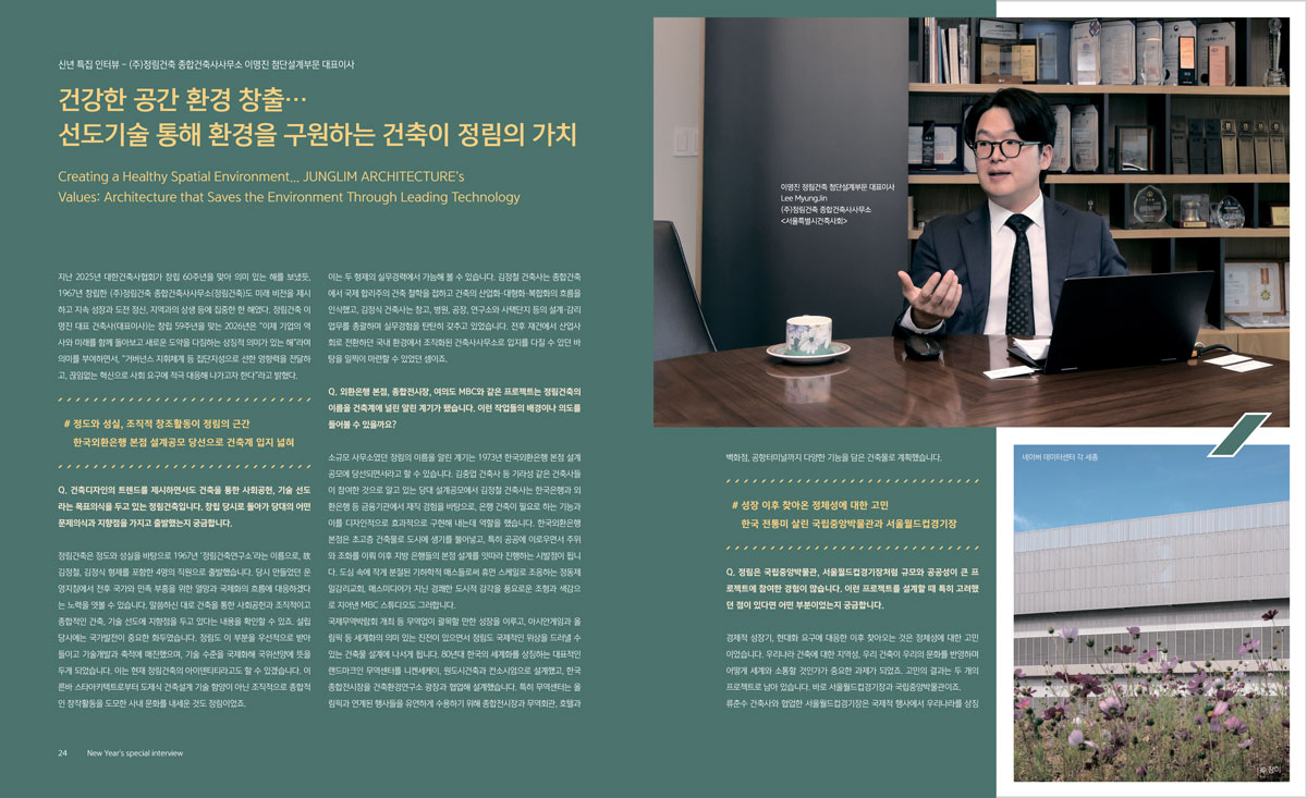 정림건축 이명진 대표이사 인터뷰가 대한건축사협회에서 발간하는 ‘건축사’ 2026년 신년호 특집에 게재되었습니다. 이번 인터뷰는 대한건축사협회 창립 60주년(2025년)과 정림건축 창립 60주년(2027년)을 잇는 시점에 기획되어, 한국 건축 현대사의 동반자로서 정림건축이 걸어온 발자취를 되짚고 앞으로의 소명을 공유하는 뜻깊은 자리로 마련되었습니다.