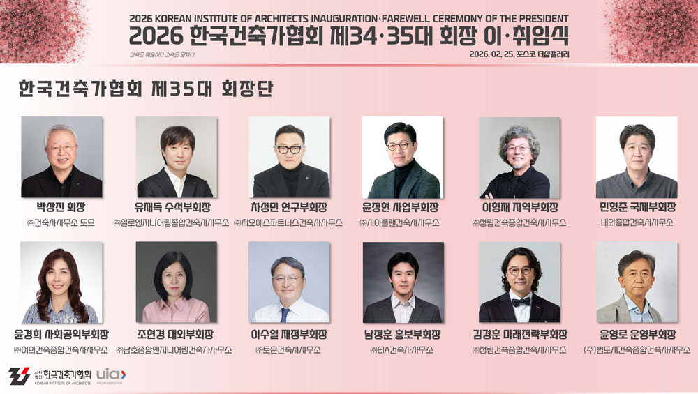 협회 창립 70주년을 앞둔 새 회장단은 AI, 기후 위기, 디지털 트윈 등 변화하는 환경 속에서 건축의 역할을 새롭게 모색해 나갈 예정입니다.