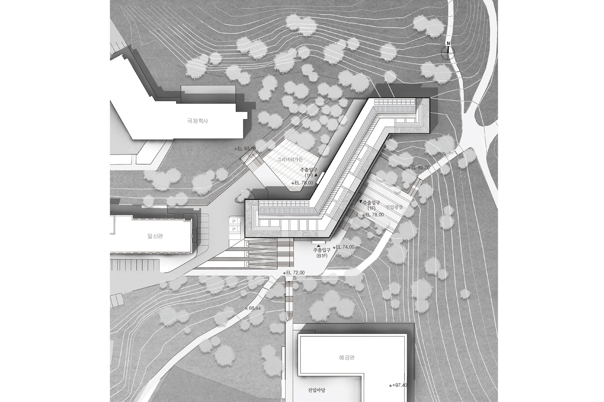 한편 남측 강의 및 실습 구역에서 접근하는 주출입 동선에서는 기숙사 영역의 열린 중정과 연결되는 커뮤니티 계단과 필로티 공간으로 개방성을 확보했다. 가파른 지형에 대응하고자 지하 1층 및 지상 1층에 다양한 출입구를 배치하고, 이들 동선은 학생들의 편의 시설 및 복지 시설을 집중 배치한 기숙사 2층까지 계단형 휴게공간으로 연계하는 계획을 통해 상징적이고 기능적인 특화공간으로 구성하고자 했다. 유지관리 측면에서는 기숙사 시설 계획 특성에 따른 모듈화 및 반복 구조 계획으로 통합관리 및 전체 자동 검토를 용이하게 하고, 안전을 위해 합리적인 동선과 피난계획의 정합성을 높였으며, 실 내부 위생 설비를 미리 검토해 발주처 및 시공사와 보다 원활히 소통할 수 있었다.