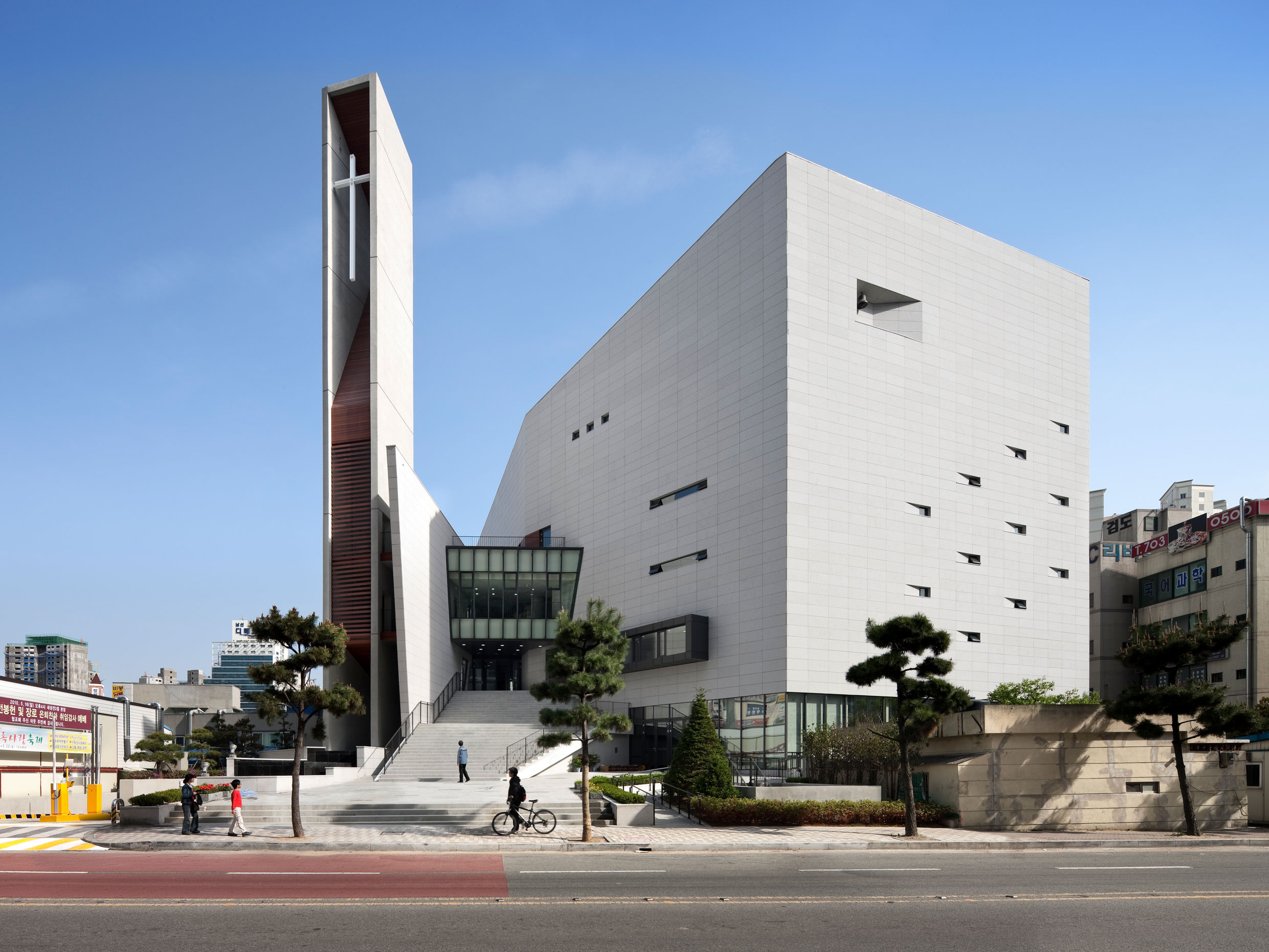 따라서 이러한 흐름을 받아, 땅에서 시작하여 하늘예배당으로 연장되는 연속적인 흐름을 갖는 동선과 입체적 공간을 구성하였으며, 그것에 의해 생성되는 다양한 레벨의 마당은 지역주민과 신도가 문화적, 종교적, 친환경적으로 소통하는 프로그램이 집적된 공간으로서 역할을 하게 되며, 이를 감싸는 외부 파사드는 대지가 갖는 특질과 법적 요구사항에 반응하여 채워지고 비워지며, 빛과 보는 각도에 따라 Multi-facade의 얼굴로 구성하여 절제된 도시의 조각으로 인식되도록 하였다.