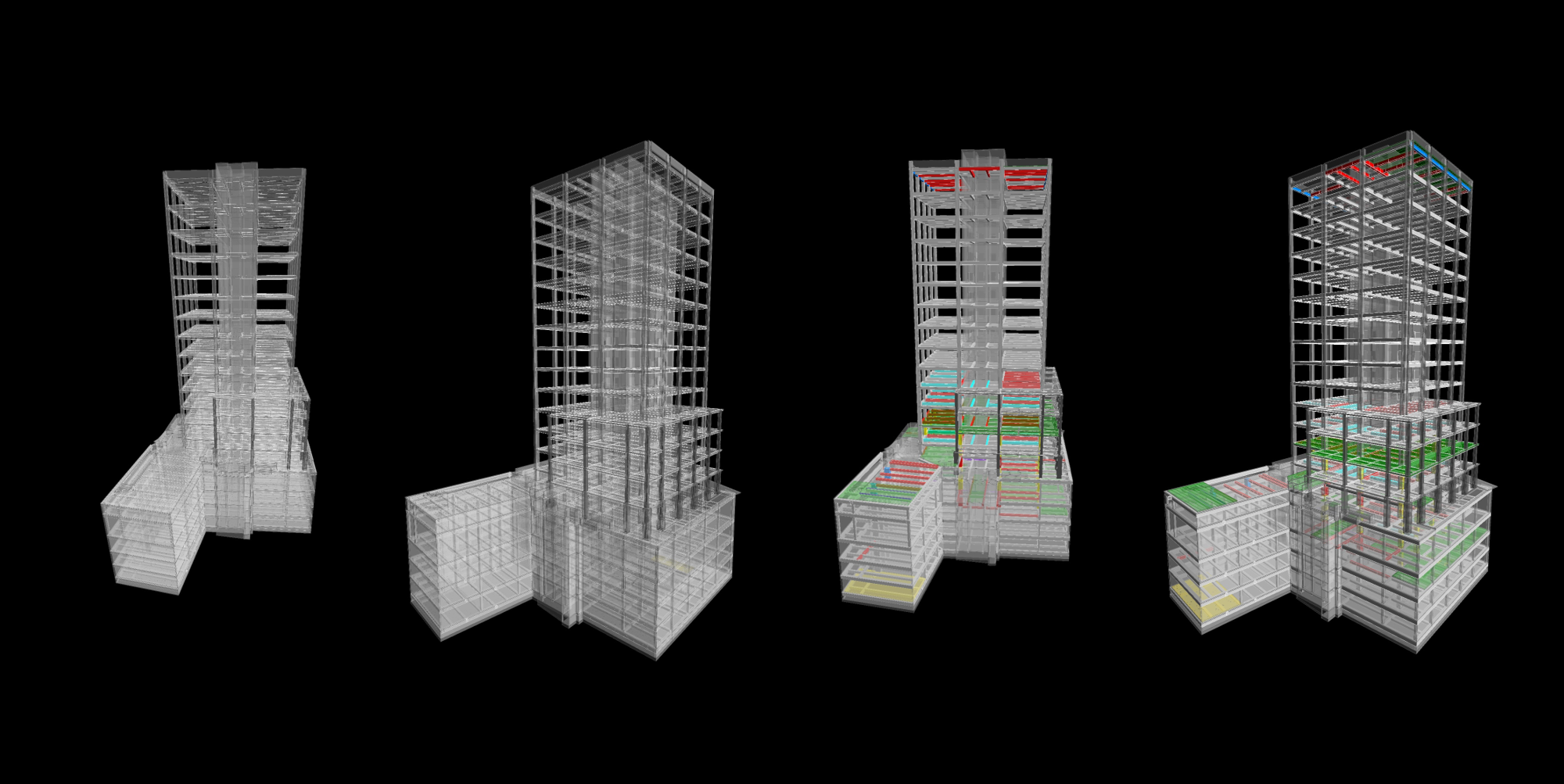 Based on the converted 3D BIM model, the structure of the building is simulated. This includes precise structural design, construction process simulation, clash minimization, quantity takeoffs, and worker understanding improvement. This process detects whether or not clashes exist among structures and with other trades, along with the construction sequence, concrete pouring sections, and formwork planning. Also, it automatically calculates material quantities and construction costs, allowing for accurate construction management.