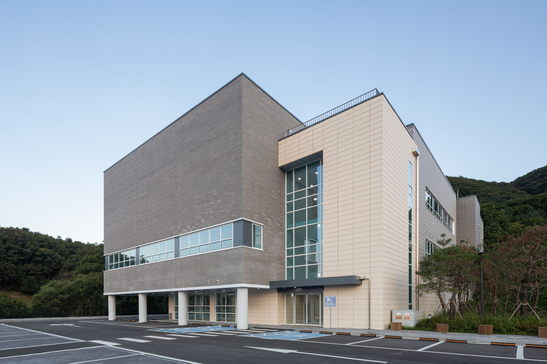 경비실은 인재개발원 및 전체 신축시설을 통합한 안내 및 보안 기능을 고려하였고, 특히 DB타운을 대표하는 Signage를 건축에 통합하여 디자인하였다.
