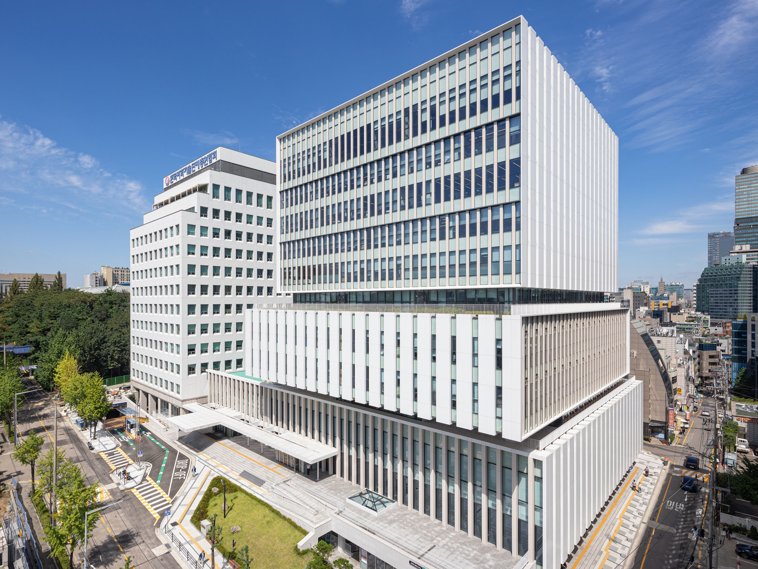 The building is largely divided into the office zone and the public open zone with sectional zoning ensuring independence between both zones. Masses are separately optimized for each facility — public service zone, office, shared office, convention hall, and neighborhood facility — to improve operational efficiency. An open plaza accessible from adjacent roads and connected green and rest spaces to Yeoksam Park provide an expanded open space for the public. The façade employs vertical patterns that intuitively metaphorize science and technology, favoring wind and view conditions. Materials such as vertical louvers, metal panels, and low-E double glazing are used for economic and maintenance efficiency.