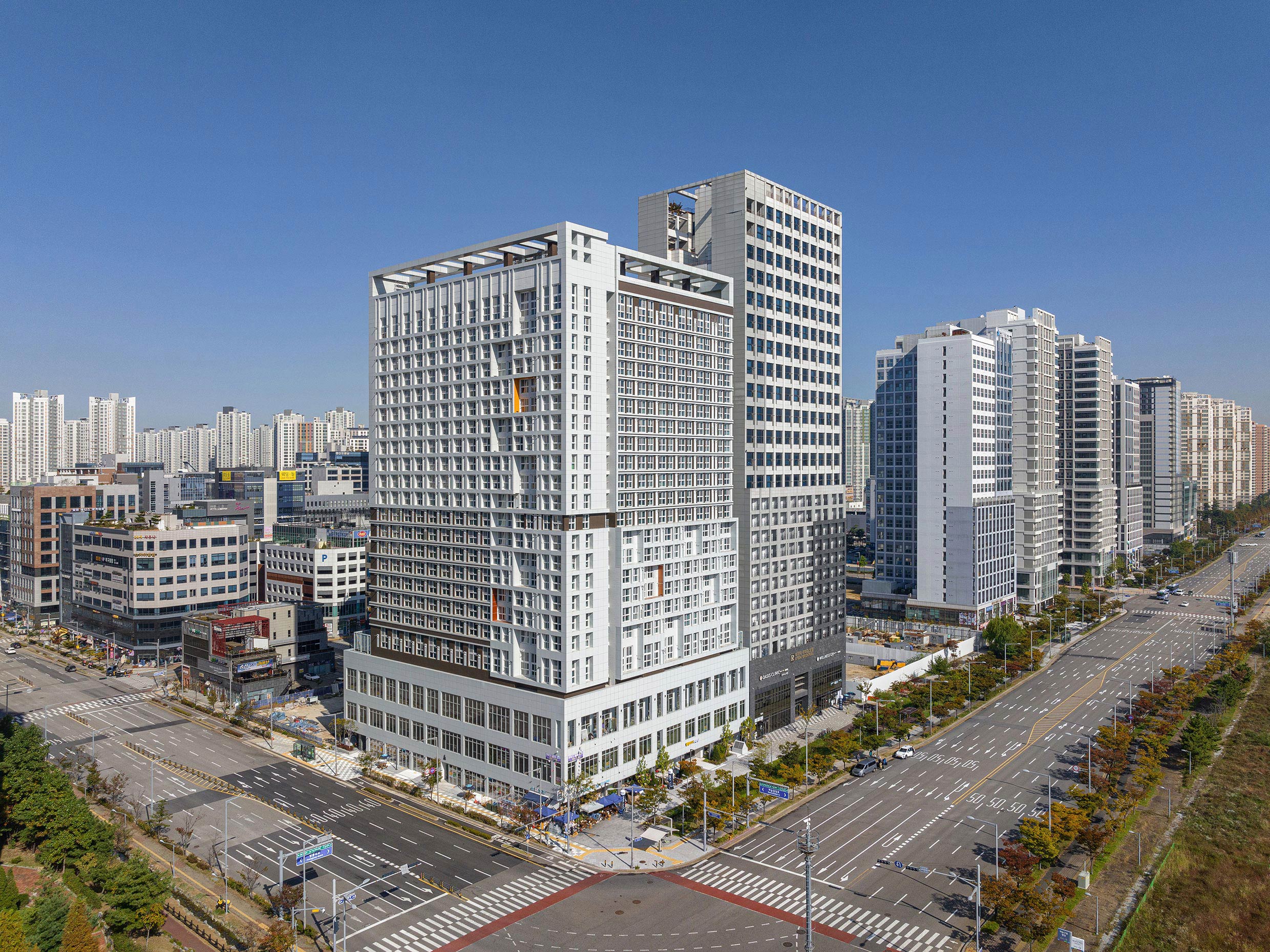 The Kwangyoung Snug Aircity, Yeongjong Sky City, located at C7-8-3BL in Jungsan-dong, Jung-gu, Incheon, proposes a cityscape that harmonizes the region, culture, and nature in connection with the surrounding landscape. The primary building uses include a three-story neighborhood facility designed to meet street-level commercial demands of the central business district and a large “officetel” complex with 589 units. Each unit offers views opening to greenery, and a rooftop garden overlooking the sea in front of Yeongjong Island was planned.