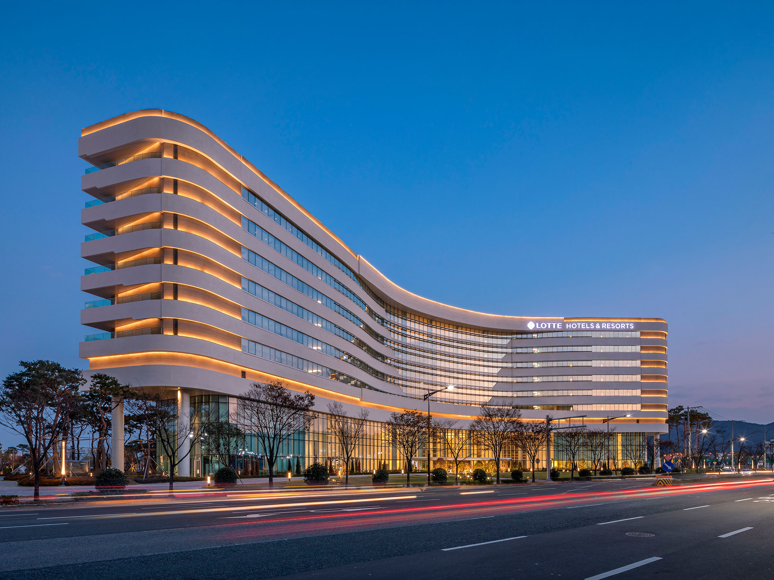 Lotte Hotel & Resort Gimhae commenced in June 2021 as a development project to utilize the remaining land within the Gimhae Tourism and Distribution Complex. Although building permits and construction commencement had been completed in 2016, the project was temporarily suspended and resumed five years later. Therefore, the design was required to newly reflect changes in visitor characteristics and market trends. The complex already features many attractions and entertainments, such as the largest waterpark in the Gyeongnam region, the Lotte Outlet Gimhae, a sports center, and a theme park. It was important for the new hotel to harmonize with these facilities as part of one integrated environment.