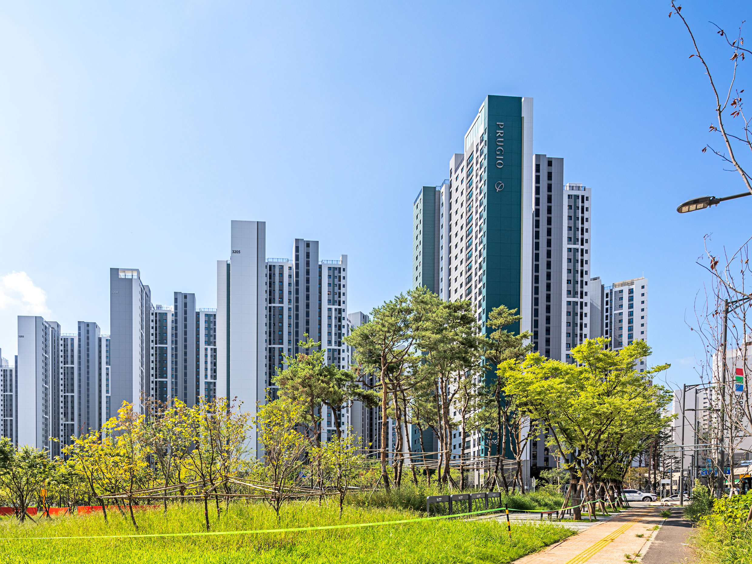 Following the northwest-facing view toward Geumjeong Mountain, a main visual axis was established through the center of the site. The residential blocks were arranged to the east and west of this axis, with those on the east side slightly angled to create semi-enclosed green spaces while their side façades help buffer traffic noise from the adjacent main road. Ancillary facilities such as a daycare center, senior welfare center, and community spaces are grouped along the green axis in a cluster-like composition inspired by grape bunches, unified under consistent design guidelines. The teal color used as the primary façade tone later evolved into the official brand color “British Green” for the Prugio brand.
