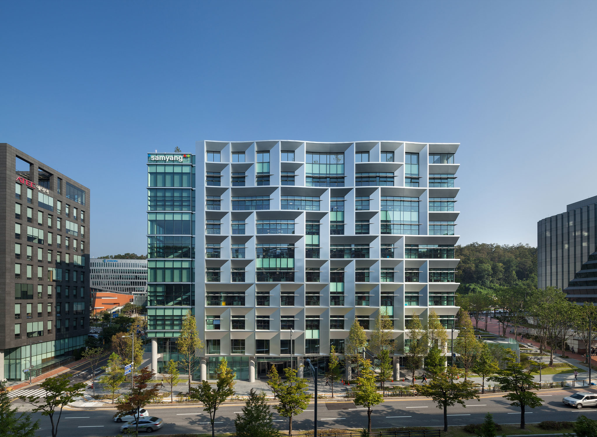 Located in Pangyo Techno Valley, the Samyang Discovery Center is a research facility for a pharmaceutical and bio company, designed to provide a pleasant work environment for researchers while maintaining strong connectivity with the local community. The architectural challenge was to fulfill the facility’s research functions flawlessly while exploring how architecture could enable public engagement in Pangyo Techno Valley, where many of Korea’s leading bio and chemical research institutes are clustered. By opening part of the site as a public space connected to pedestrian pathways and introducing piloti spaces, the design creates an environment where pedestrians can pause and relax. Inside, workspaces are arranged around a central atrium to bring in daylight and encourage visual interaction among users.
