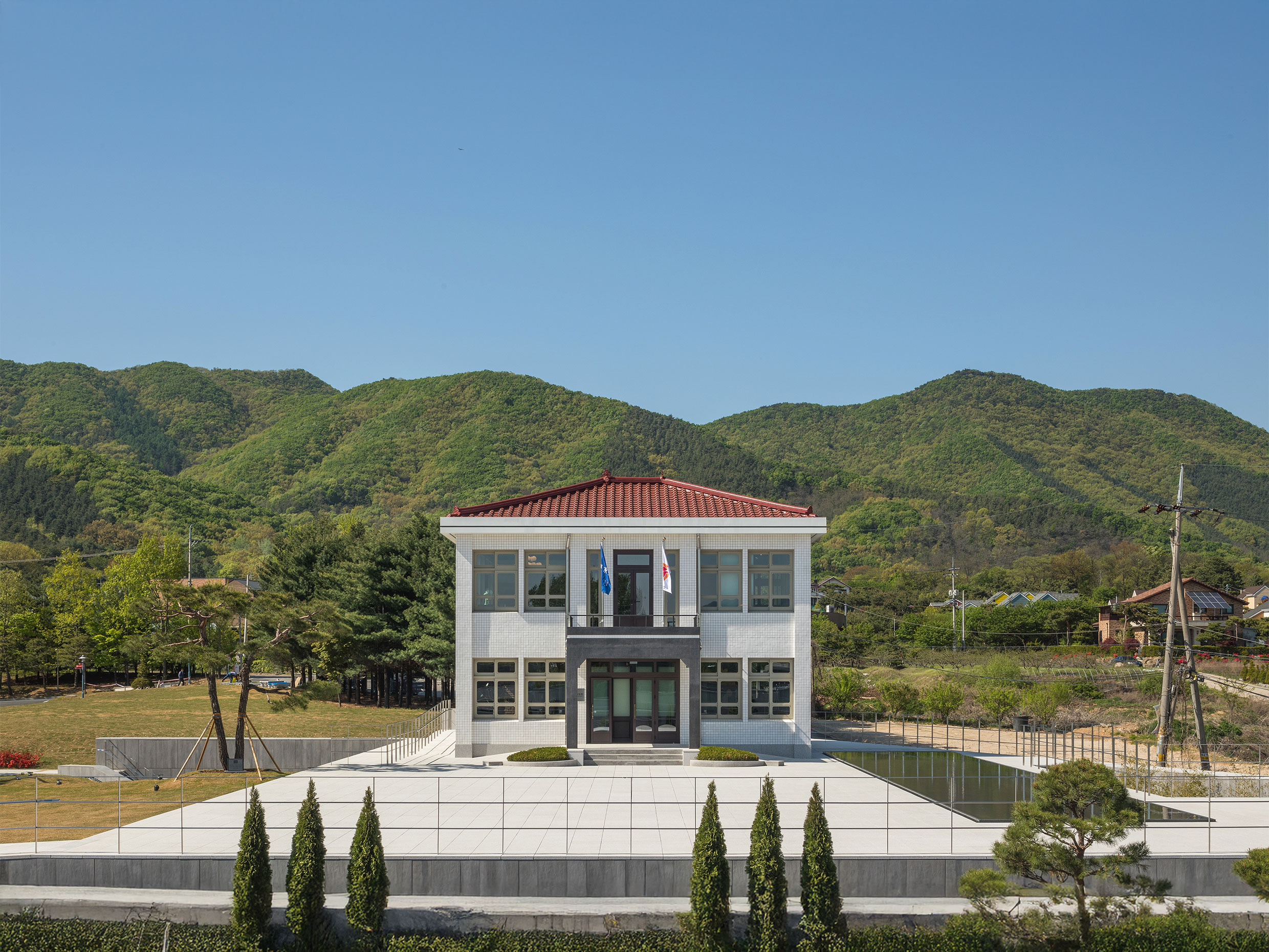 Junglim Architecture’s work started with selecting the specific location for the museum within the SK Academy site. Once the site was chosen, the design focused on “restoration.” Efforts were made to replicate the original proportions and materials as faithfully as current laws and environmental conditions allow. Since the original buildings accumulated a long history at their previous site, building the museum involved more than simple relocation and restoration. Just as a transplanted tree carries the soil around its roots, the design sought to recover the spatial context embedded in the original site’s history within its new location. The main approach road, which for over sixty years embodied SK’s daily life and passage of time, is abstracted as a “reflecting pond,” beside which the main building is situated. The management building is reborn as a memorial hall, placed in a sunken podium with additional underground exhibition space that extends the exhibition flow of the main building.
