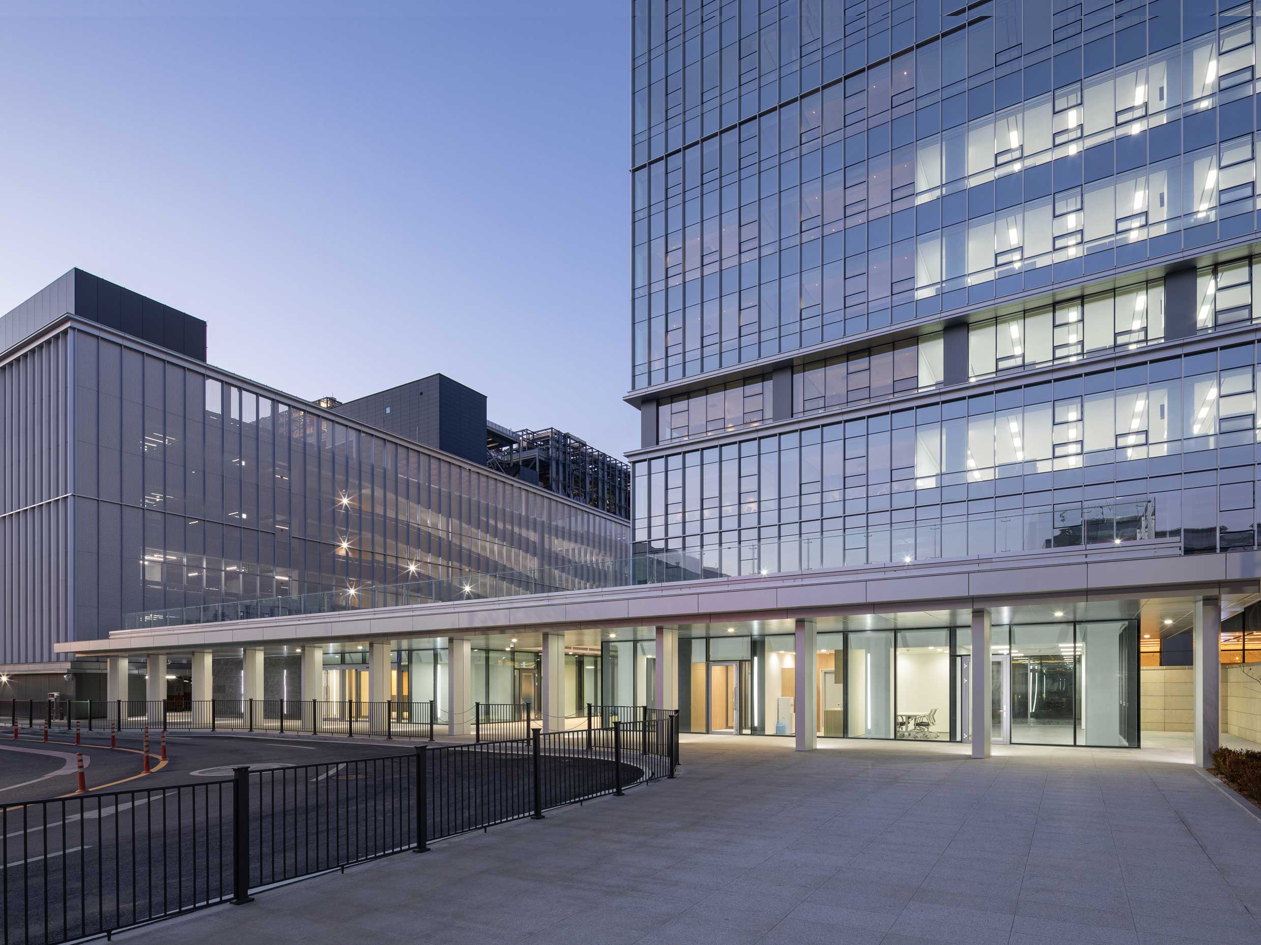 Creating a “campus” atmosphere within the complex requires each building to have its own character while maintaining overall design consistency. The Supex Center shares a façade design language with the fabrication facilities (fabs) on campus: the lower floors feature dark granite and aluminum panels, while the upper floors use lighter colors and colored low-E glass. To reduce vibrations and noise from the parking tower and fabrication facilities connected to the office space, the design employs eco-friendly materials and structural reinforcements.