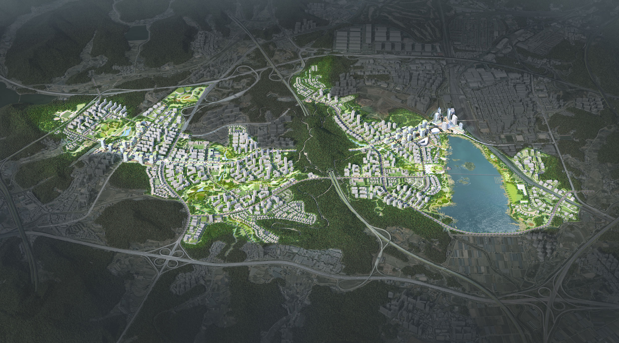 Junglim’s proposal focused on organizing the urban spatial structure based on several key points. The plan aims to establish the third-phase new town district’s character as a hub that interconnectedly develops the urban features of Uiwang, Gunpo, and Ansan. It also emphasizes building a regional transport network connecting the Suwon-Gwangmyeong Highway, Yeongdong Highway, West Coast Expressway, Banwol Station, and Uiwang Station to enhance accessibility and usability. Considering the long-preserved natural ecosystems within the greenbelt zone, the plan proposes creating a green and park network centered around Mount Gubongsan, as well as waterfront ecological areas linked with Lake Wangsong, to protect ecological environments. In terms of urban functions, it maximizes land use efficiency by promoting mixed development around stations like Banwol and Uiwang, and by introducing specialized zones that harness each city’s resources. The overall goal is to create a multi-faceted urban space where nature, people, daily life, and the environment coexist harmoniously.