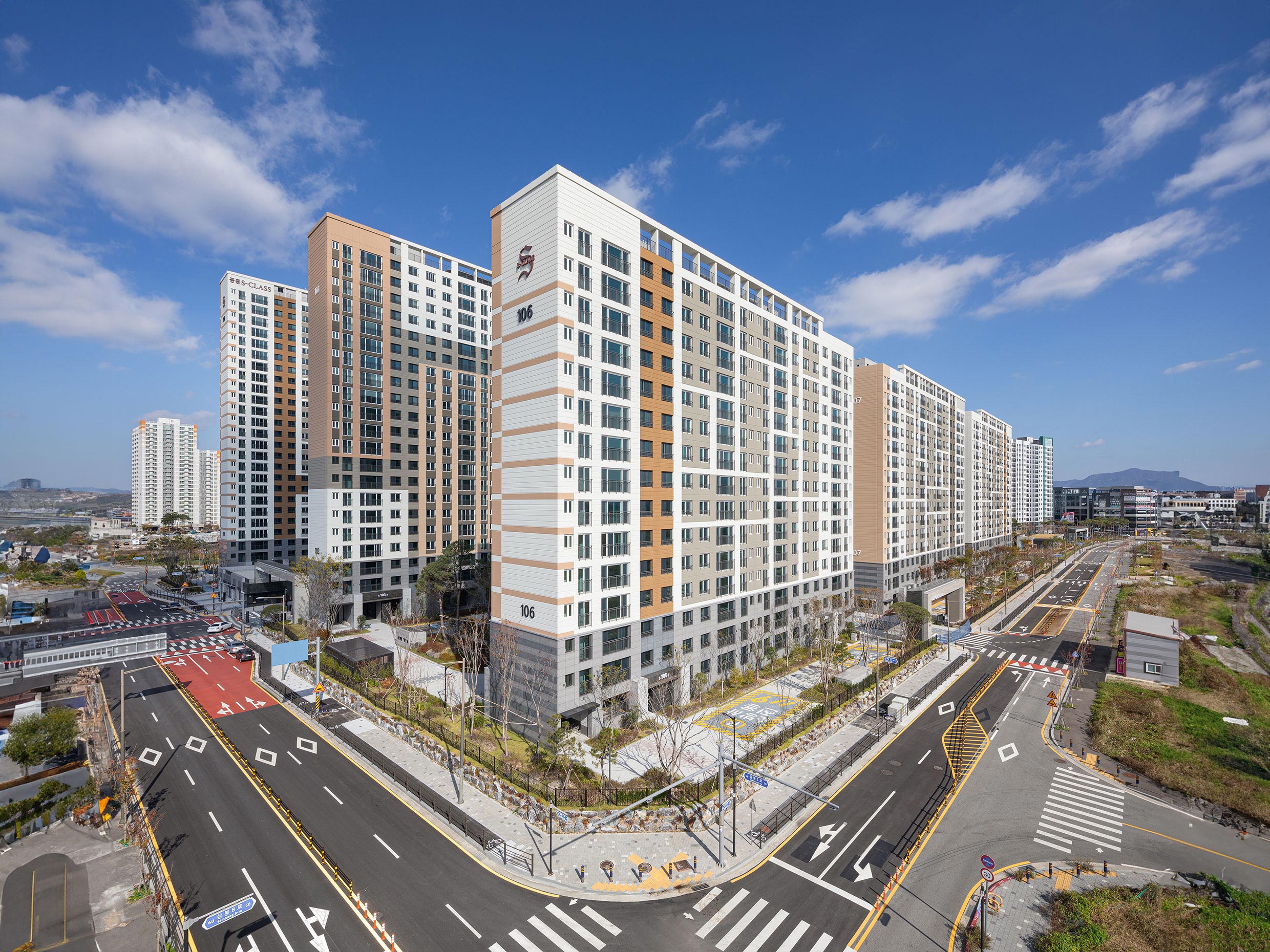 The Jungheung S-Class Edupark, located in Block B-3 of the Public Housing District, Sambong, Wanju, is situated with the Mangyeong River to the south and the Wanju Industrial Complex to the north, providing abundant natural and human infrastructure. The 40-meter-wide view axis is planned to connect with the neighborhood park on the southeast side, allowing residents to enjoy a nature-friendly living environment. All units are of the four-bay type to increase marketability, and the building layout combines four units in a slab-type structure to maximize open space within the complex. The facades of specialized units and general units are differentiated to provide visual variety while using colors that shape a soft urban image. The community facilities include a multi-purpose sports facility spanning two floors, a golf practice range, a fitness center, a resident meeting room, a senior citizens’ center, and a daycare center.