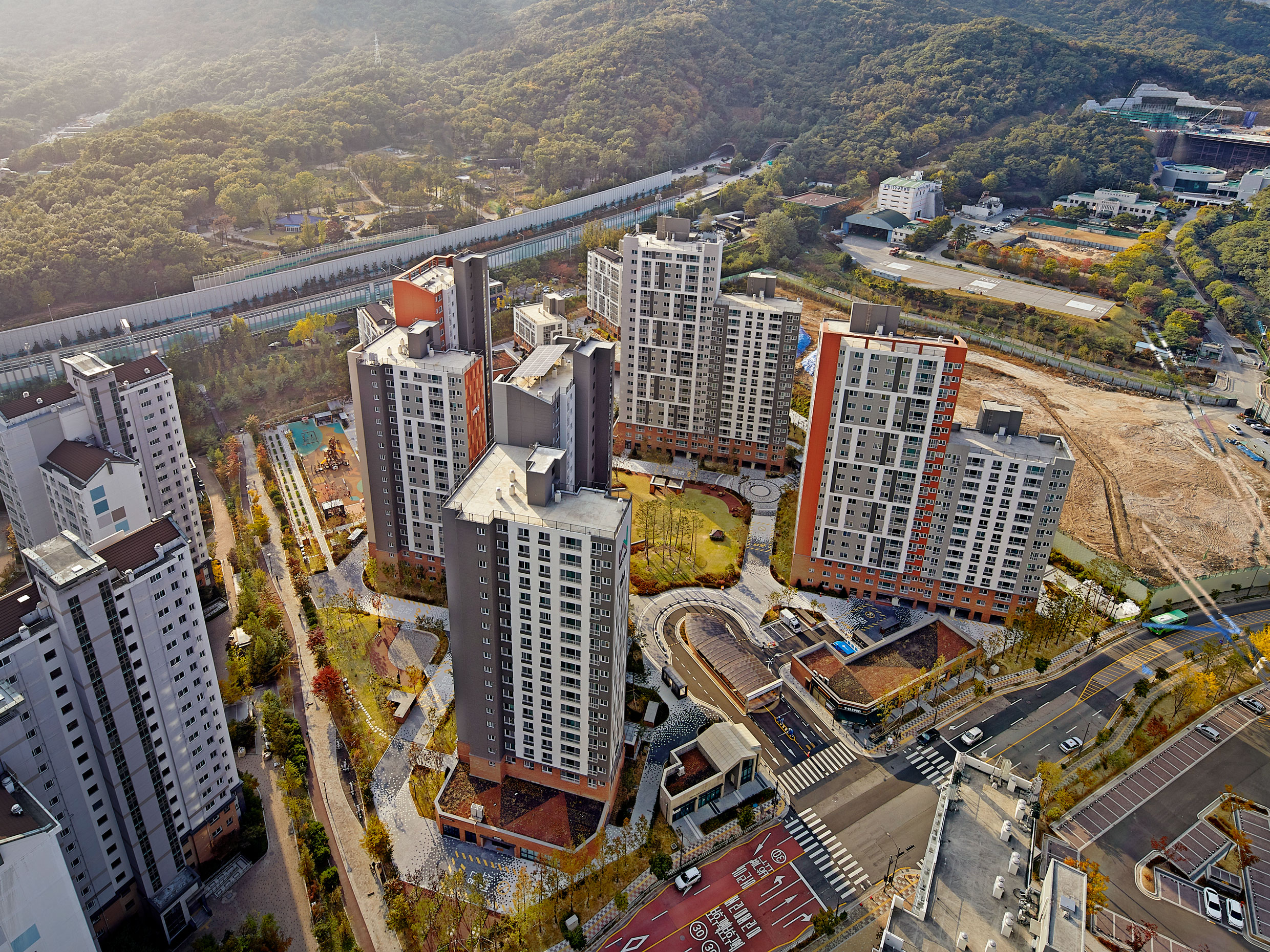 Located at the center of a public housing complex, the site is within a five-minute walk of an elementary school and close to Byeollae IC, which connects to the Seoul Ring Expressway, ensuring a stable living environment. With Mt. Bulam and Mt. Surak to the west and Deoksong Stream to the east, the site enjoys a natural setting characterized by baesanimsu (“mountain at the back, water at the front”). Accordingly, the buildings were oriented to the south to maximize daylight, while the view axis and the wind path were opened toward Mt. Bulam to enhance environmental comfort.