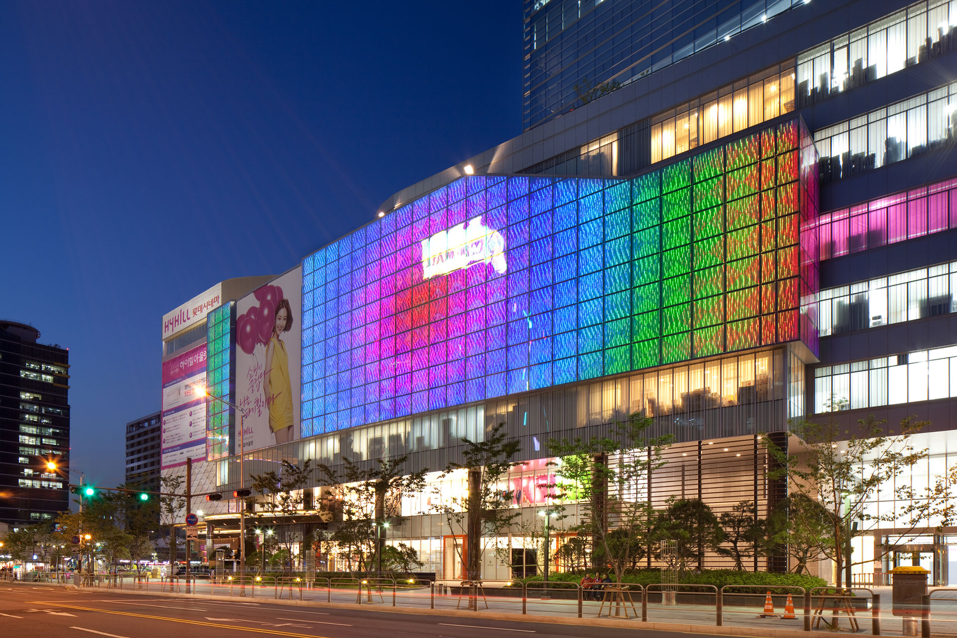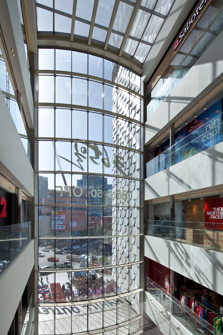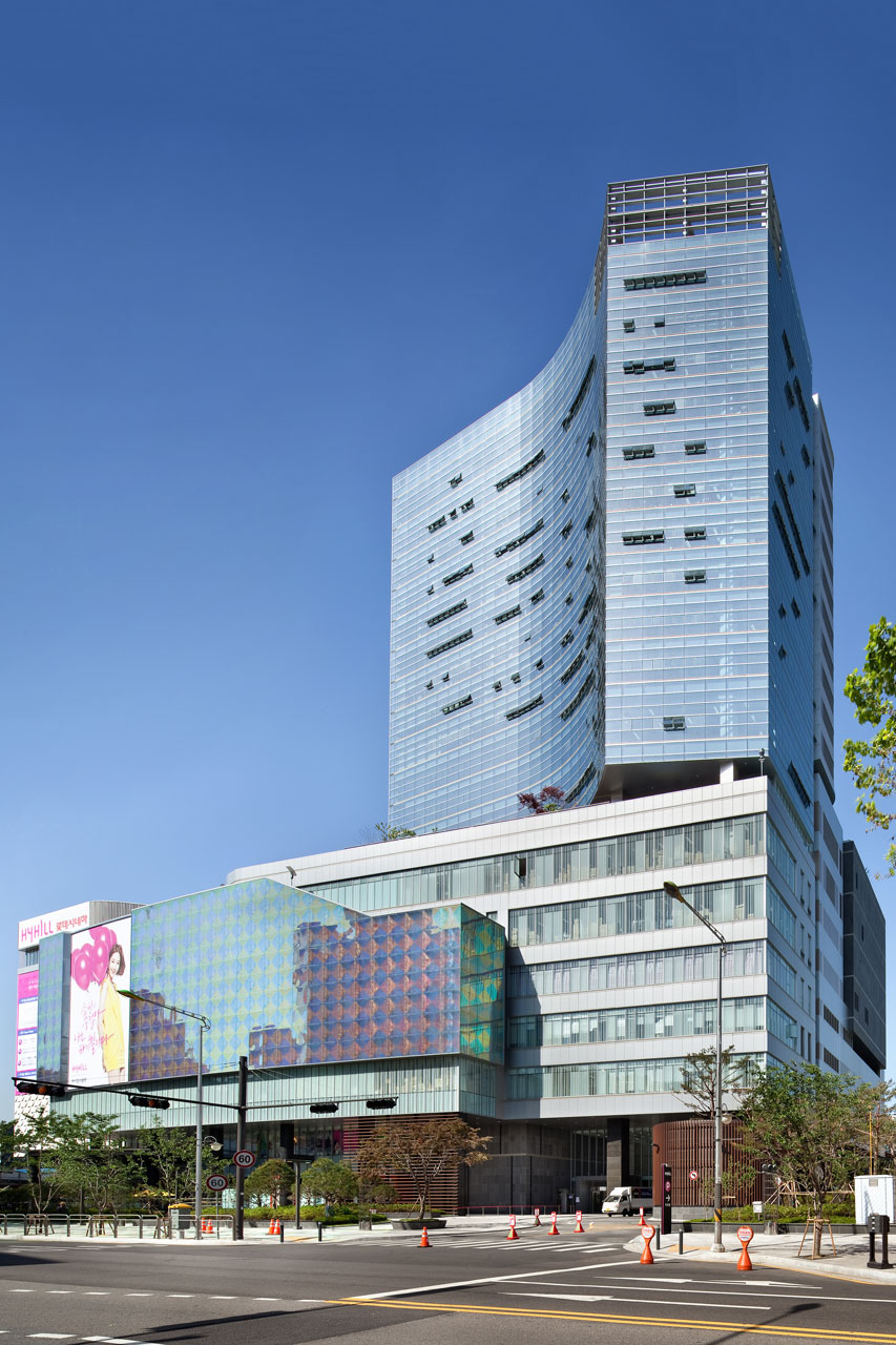 ‘하이힐’에는 대형 이벤트 홀을 중심으로 문화시설(Multiplex Cinema)과 전문 식음료 공간(F&B), 외부 휴게 공간이 연계된다. 그 위에 위치한 업무시설은 사람과 패션의 흐름을 부드럽게 끌어안는 곡면 디자인으로 주변 건물들의 경직된 이미지와 대비되는 열린 조망의 밝고 쾌적한 환경을 제공한다.