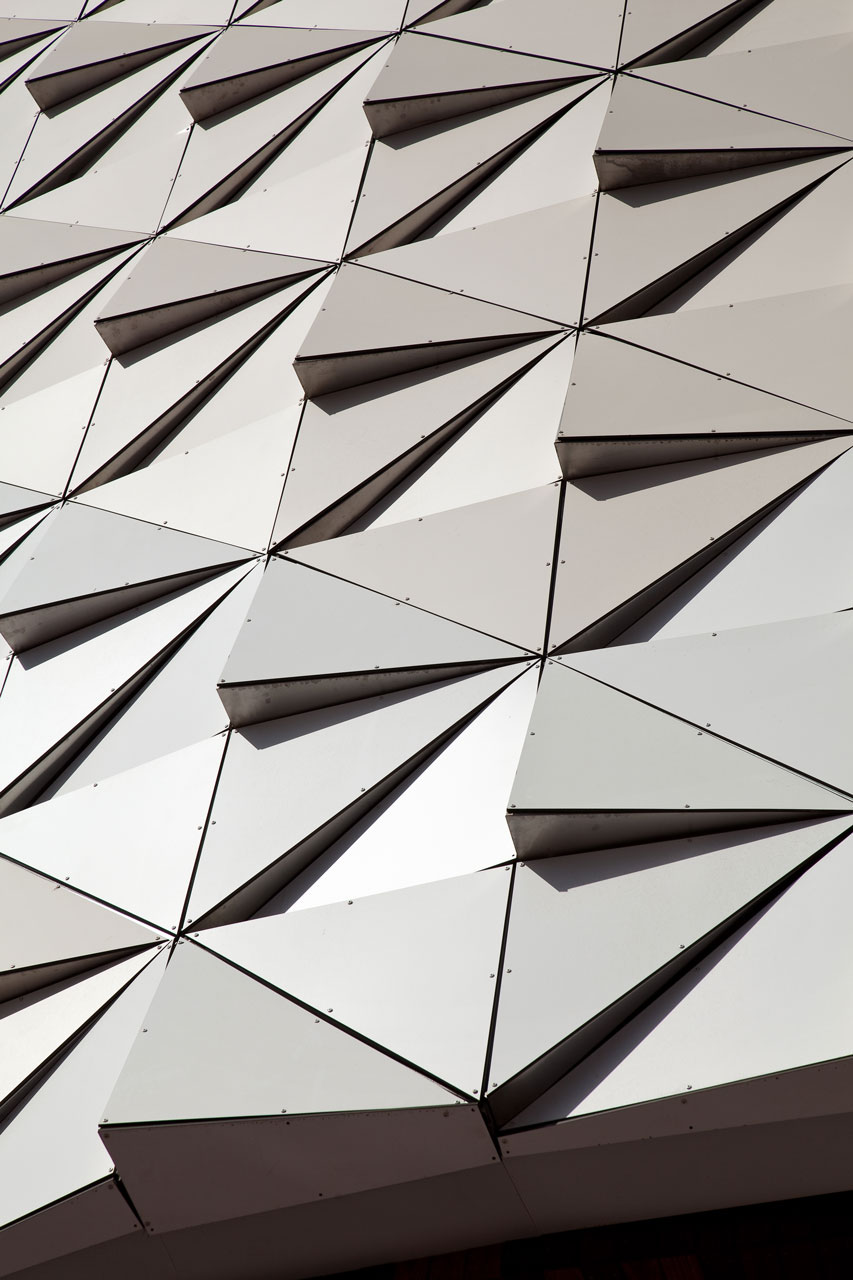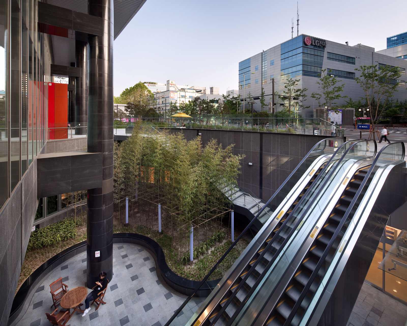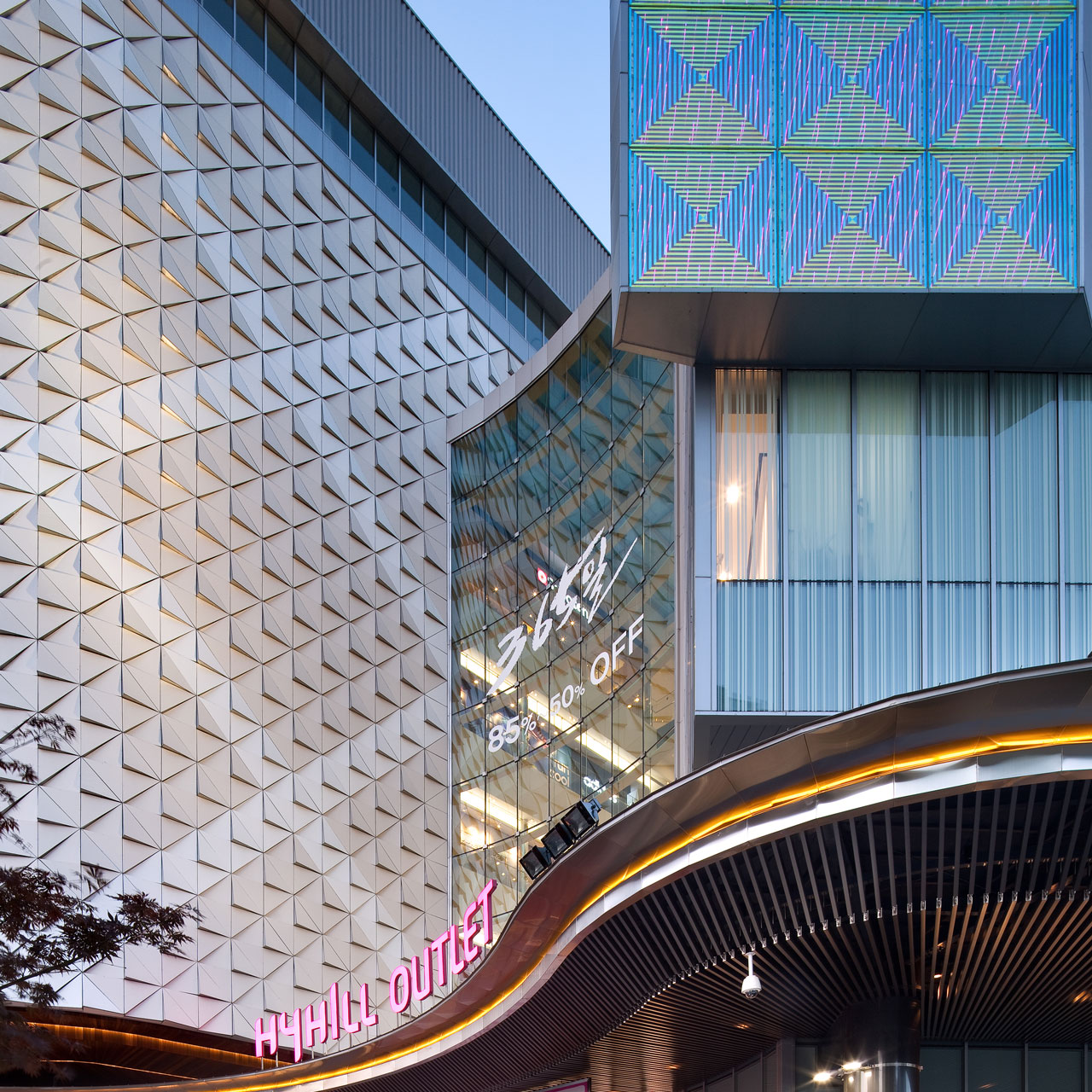 마리오 사거리를 서로 마주보며 형성된 아울렛 세 곳 중 하이힐 아울렛은 유일하게 전면의 진입 광장을 가진다. 이러한 공공에 대한 배려와 태도는 공장 창고에서 출발, 변형되어 현재에 이르렀기 때문에 주변 경쟁 시설들과 달리 ‘하이힐’만의 보다 큰 상업적 가치와 차별화된 특성을 가지기 위함이다. 전면 광장에 들어서면 옷의 섬유 조직을 건축적으로 형상화한 다미에(damier, 프랑스어로 격자 무늬) 패턴의 진입부와 마주하게 된다. 패턴의 입체적 변형은 빛과 그림자의 다채로운 변화를 통해 깊은 계곡으로 흐름을 이끈다. 역동적인 형태의 주 출입구 캐노피는 흐름을 받아들이는 입구를 나타내는 동시에 전면 광장을 서포트하는 기능을 한다.