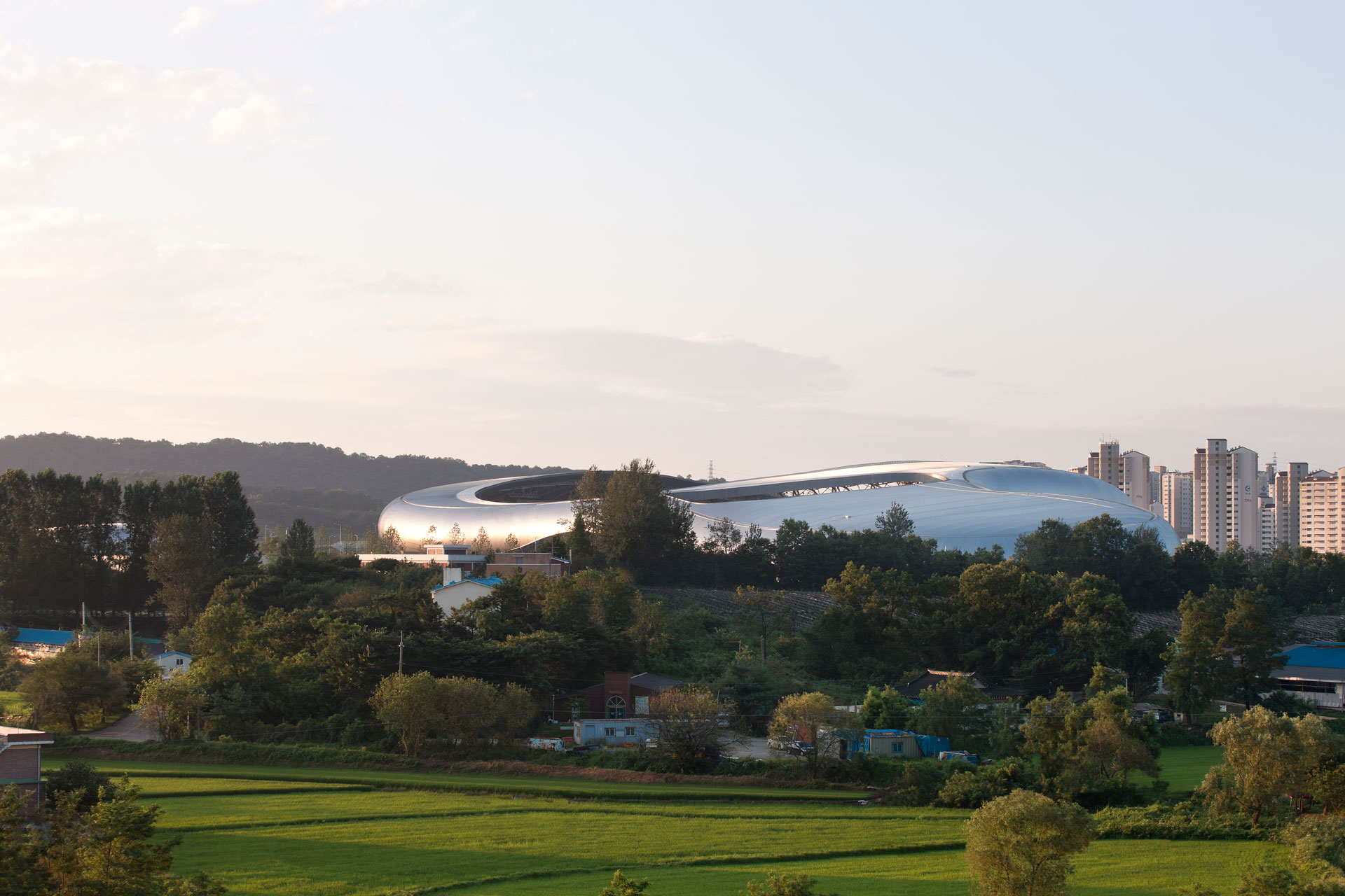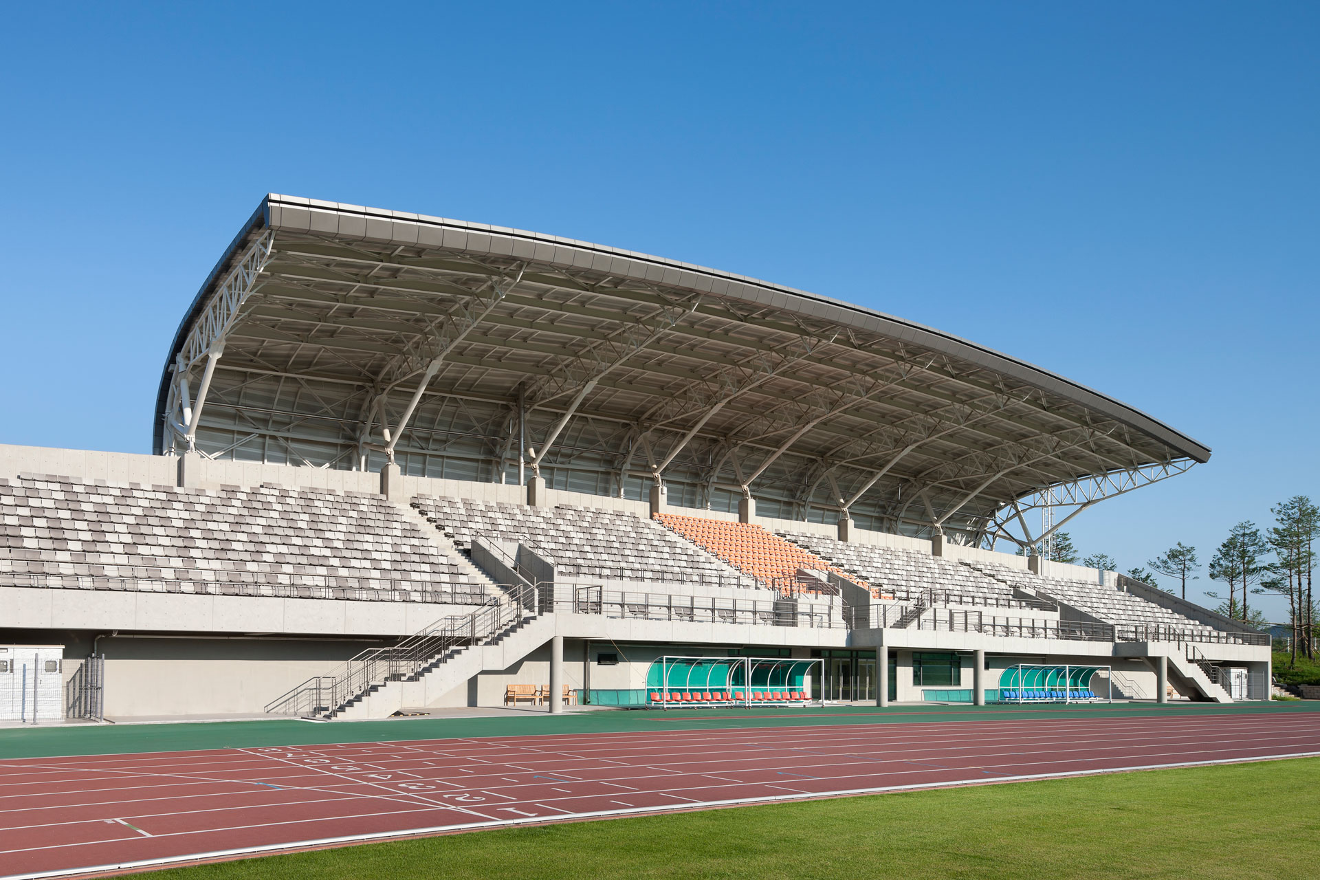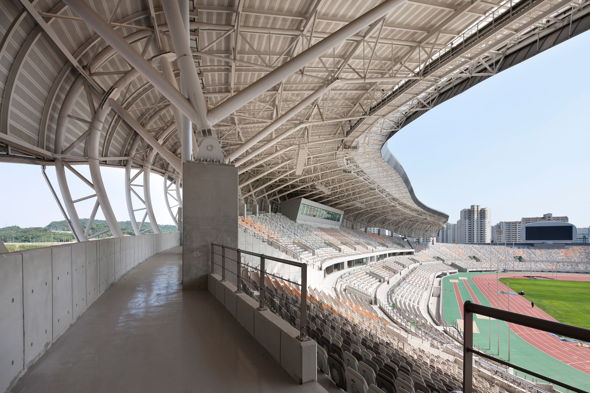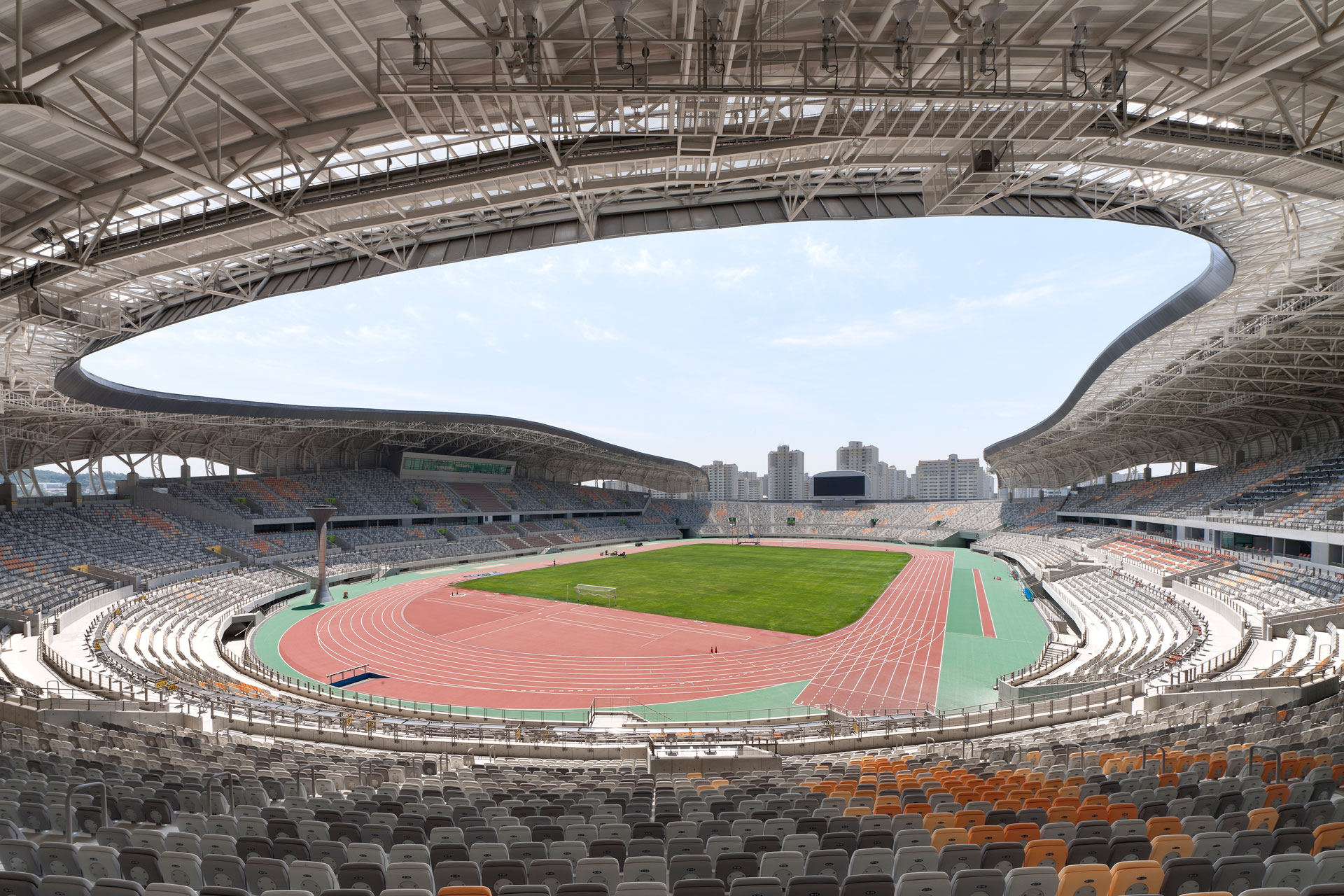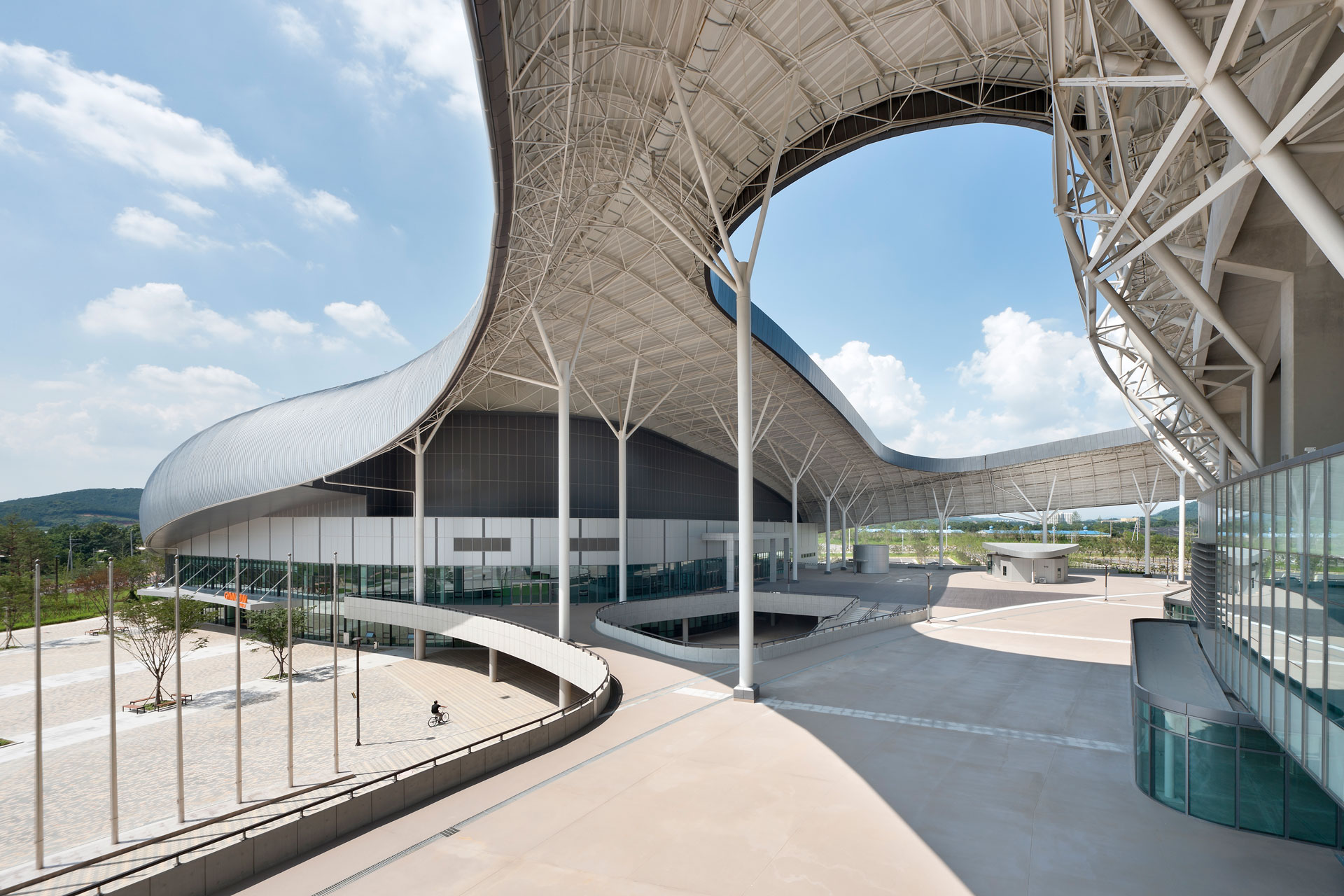 전국체전을 비롯해 각종 국제경기를 무리 없이 개최할 수 있는 경기타운의 기본 기능에 충실하기 위해 주 경기장의 관람석 배치는 선호도가 높은 동서측 스탠드에 60% 이상을 집중 배치했으며, 대지 전체가 하나의 큰 자연공원을 이루는 공원 속의 경기장으로 계획했다. 주경기장과 실내체육관은 지붕으로 연결되면서 두 건물이 단일 매스가 되는데, 둘은 각기 다른 높이와 방향성을 가지기 때문에 연결 지붕은 비정형의 형상이 된다. 평면과 단면의 합리적 규칙을 유지하면서 자연스러운 지붕 형태를 만들기 위해 3D 커브 디자인으로 여러 연결 방식을 검토했다.
