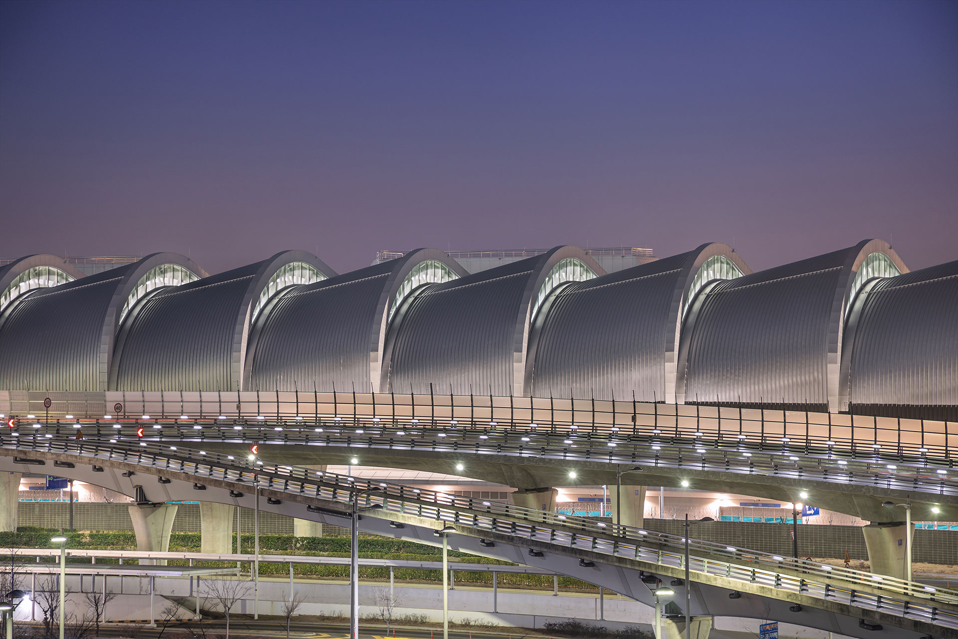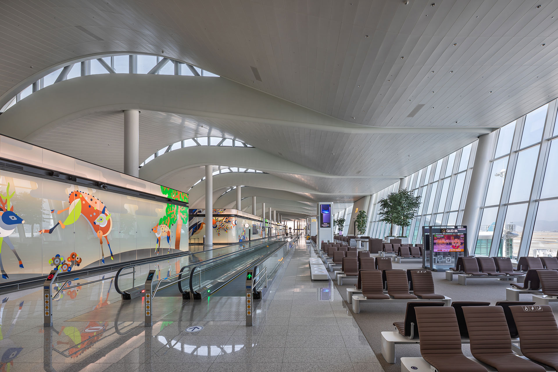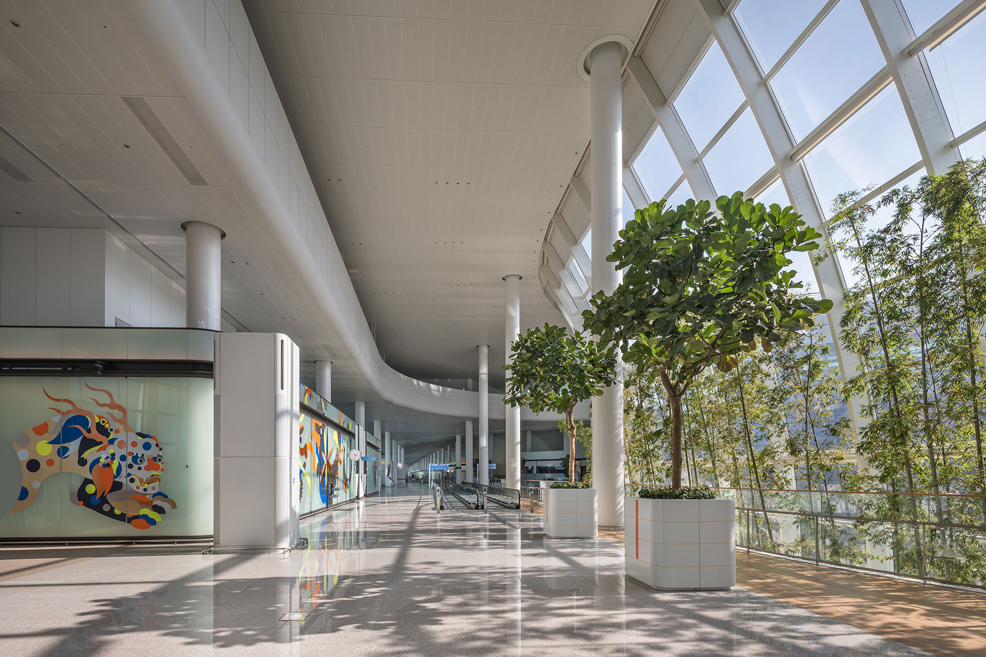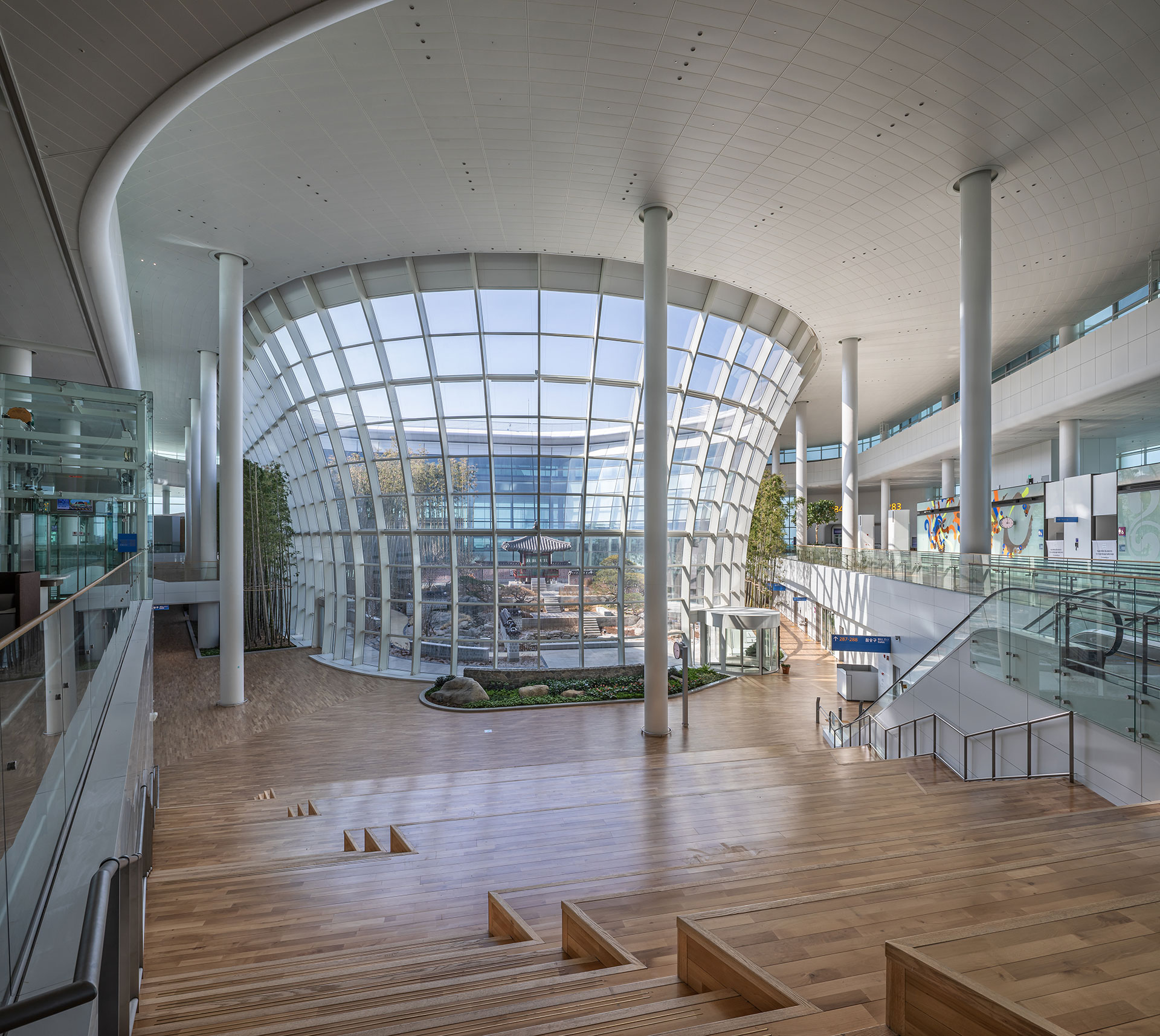 확장된 콘코스는 약 800m에 이른다. 물리적으로는 길어진 거리이지만, 설계는 이를 단순한 이동 통로가 아닌 ‘경험의 시퀀스’로 전환하는 데 집중했다. 공항 전체의 유기적 조형 언어를 유지하면서 기계적 단위 모듈을 적용해, 반복 속에서도 안정감 있는 리듬과 공간 흐름의 변화를 느낄 수 있도록 했다. 초승달 형태를 띤 모듈 사이 틈새로 스미는 북측 자연광은 인공적 환경에 자연을 끌어들인다. 3차원 곡면의 형태를 따라 커튼월은 위로 갈수록 확장되는 형상으로 하늘을 향한 개방감을 강조하고, 복잡한 지오메트리의 천창은 기술적 해법을 넘어선 건축적 완성도를 보여준다. 콘코스 말단의 외부 정원은 끊임없이 흐르는 공항 경험 속에 의도된 ‘정지의 순간’을 제공한다.