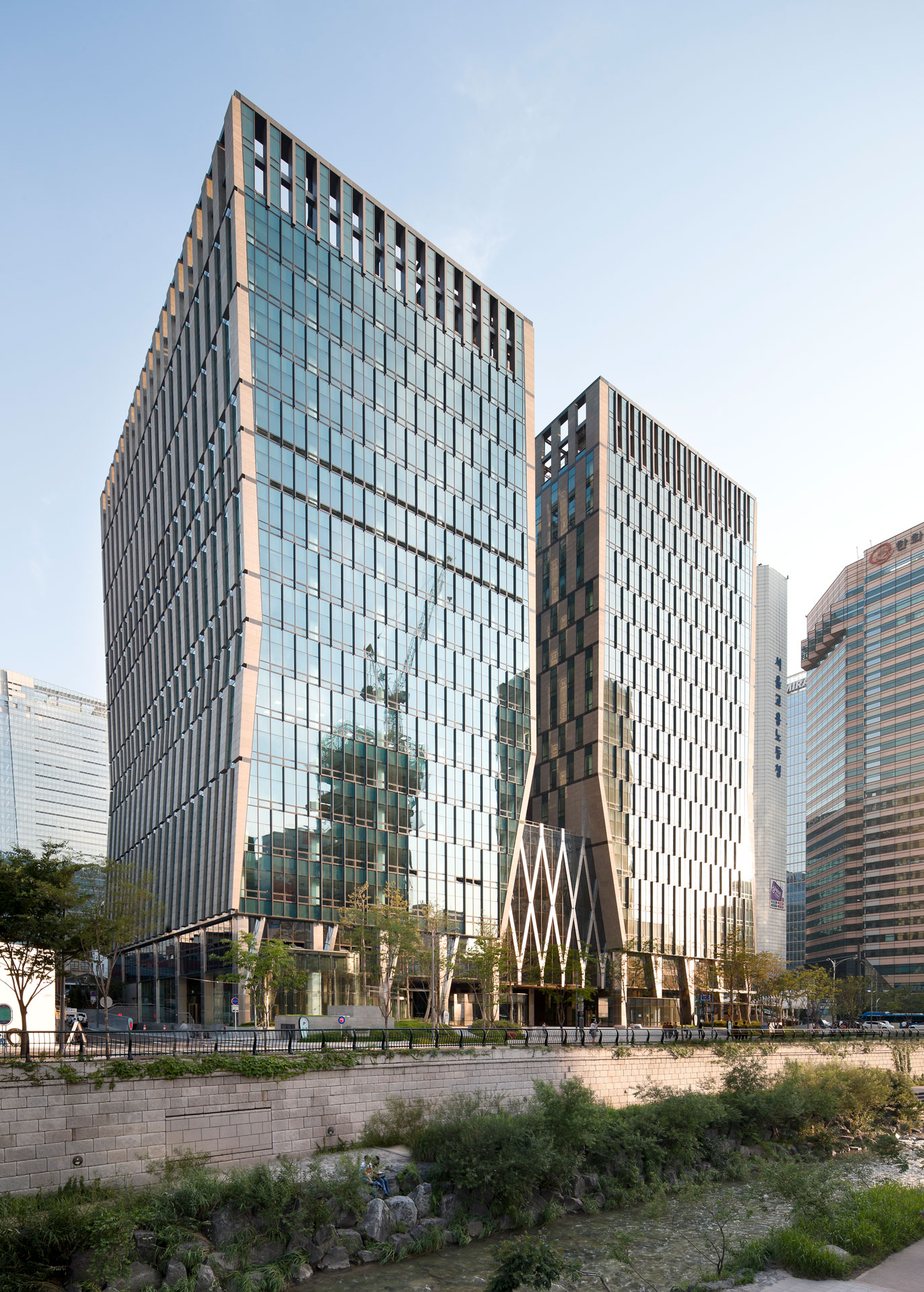 건물의 1층은 공공의 보행과 상업시설로의 접근을 극대화하기 위해 독립된 매장 사이로 사람들이 자유롭게 거닐 수 있는 배치안을 실현시켰다. 두 개의 매스 사이는 6층까지 연결되는데, 일반적인 포디움의 구성을 버리고 게이트의 저면이 타워를 받쳐주는 이미지를 구현했다. 무엇보다 17층밖에 되지 않는 높이의 한계로 어쩔수 없는 비례의 둔탁함이 풀어내야 할 큰 숙제였다. 외곽부의 기울인 면은 이러한 비례의 부족함을 채우기 위한 제스처였고 게이트라는 이미지에 힘을 실어줄 수 있는 방법으로 재해석되었다. 인사동의 입구에서 남산을 통해 강남으로 넘어가는 지점이기도 하고, 청계천의 시작점에서 보이는 건물의 꼭지는 건축가로서 이뤄내고 싶은 충분하고도 남을 만한 가치를 품고 있다.
