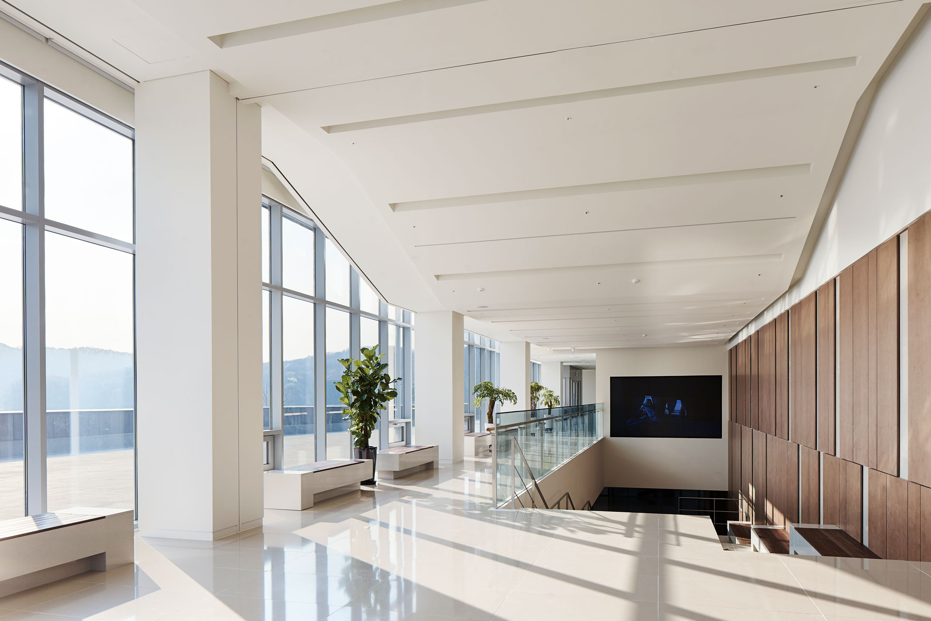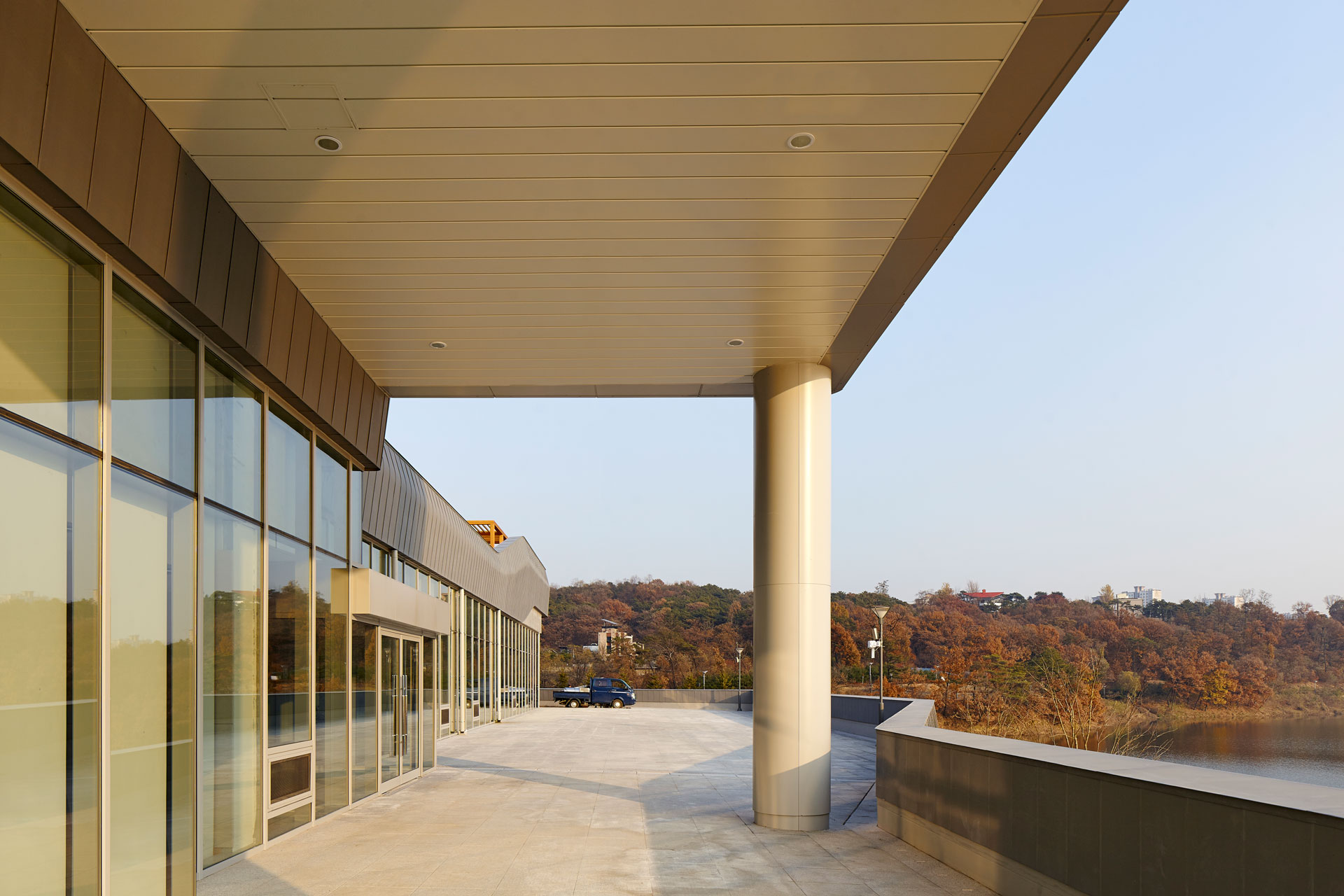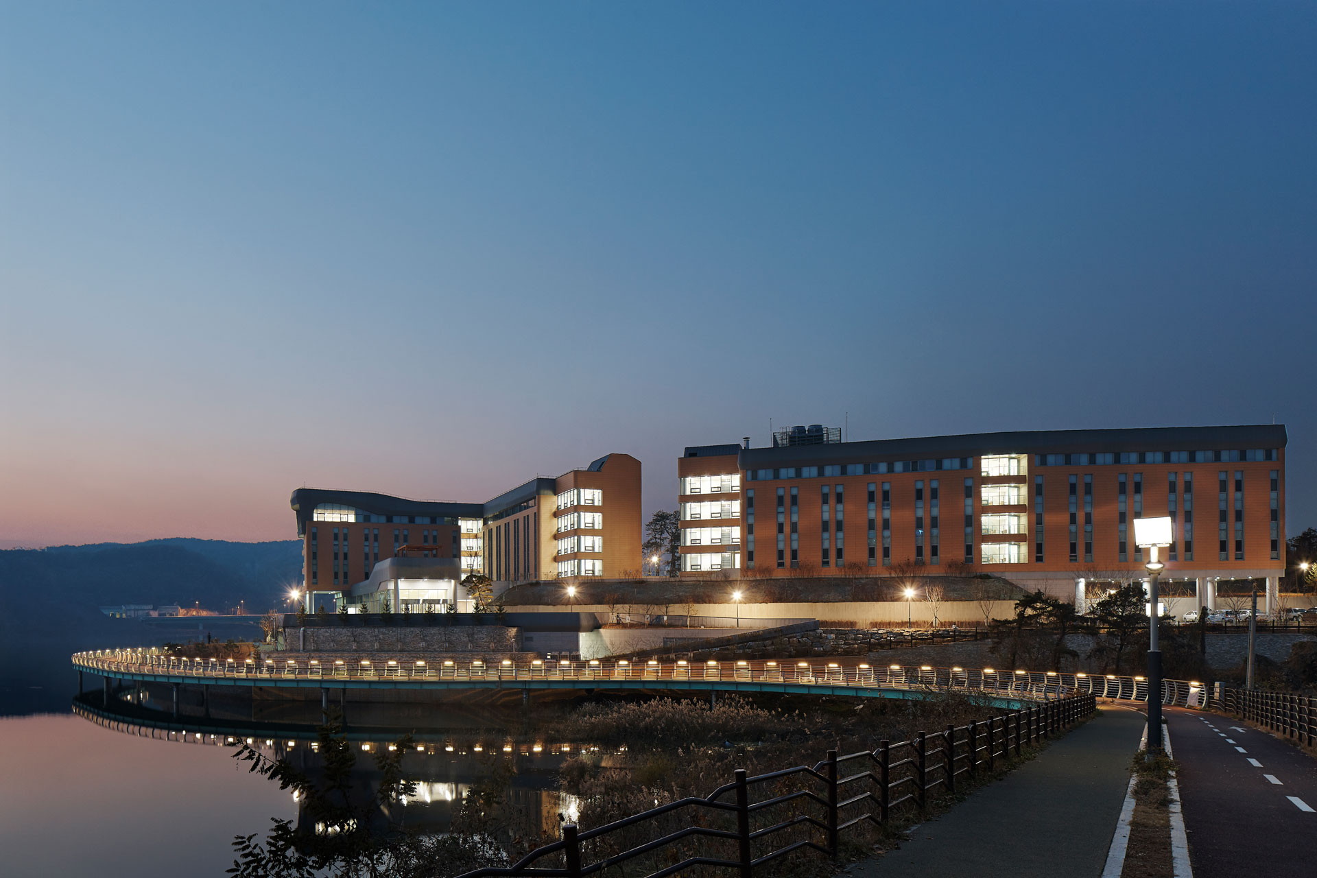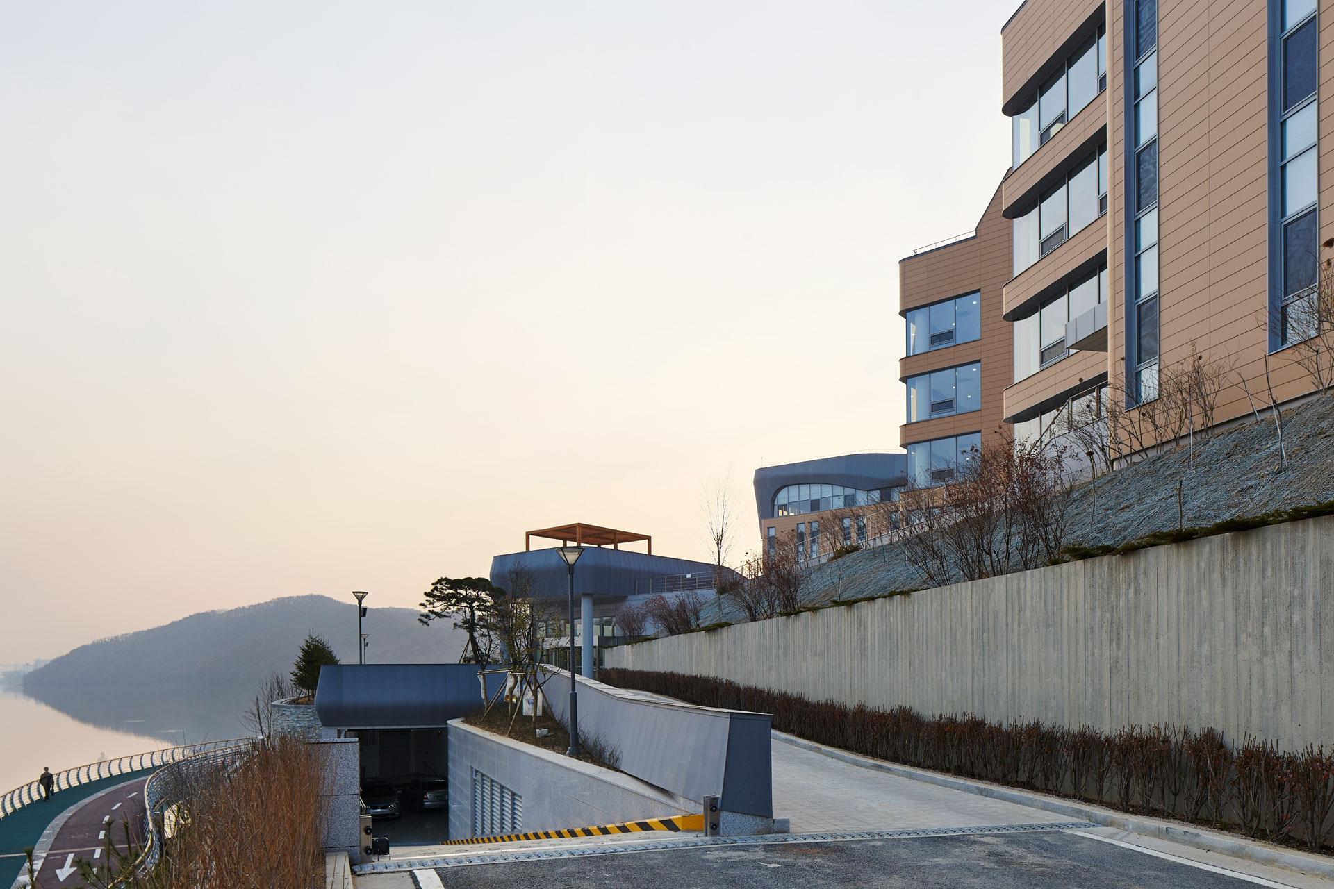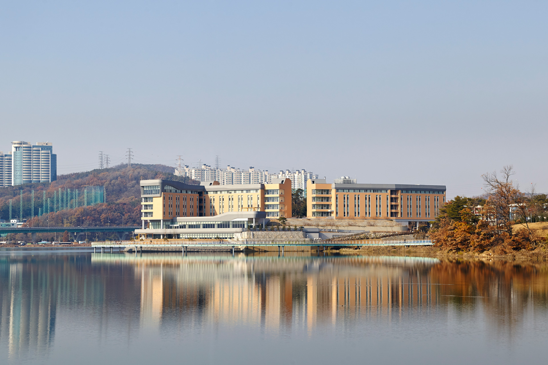 기존 지형의 형상과 레벨을 존중하는 것을 시작으로 주변의 수공간과 녹지공간을 최대한 연수원으로 끌어들이는 배치로 구성하였으며, 호수 조망이 가장 좋은 곳을 빌딩으로 점유 하지 않고 열린 공간으로 남겨두려는 의지를 바탕으로 연수원의 중심에서 정적인 활동과 동적인 활동이 일어날 수 있는 이벤트 공간을 중심에 배치하였다.