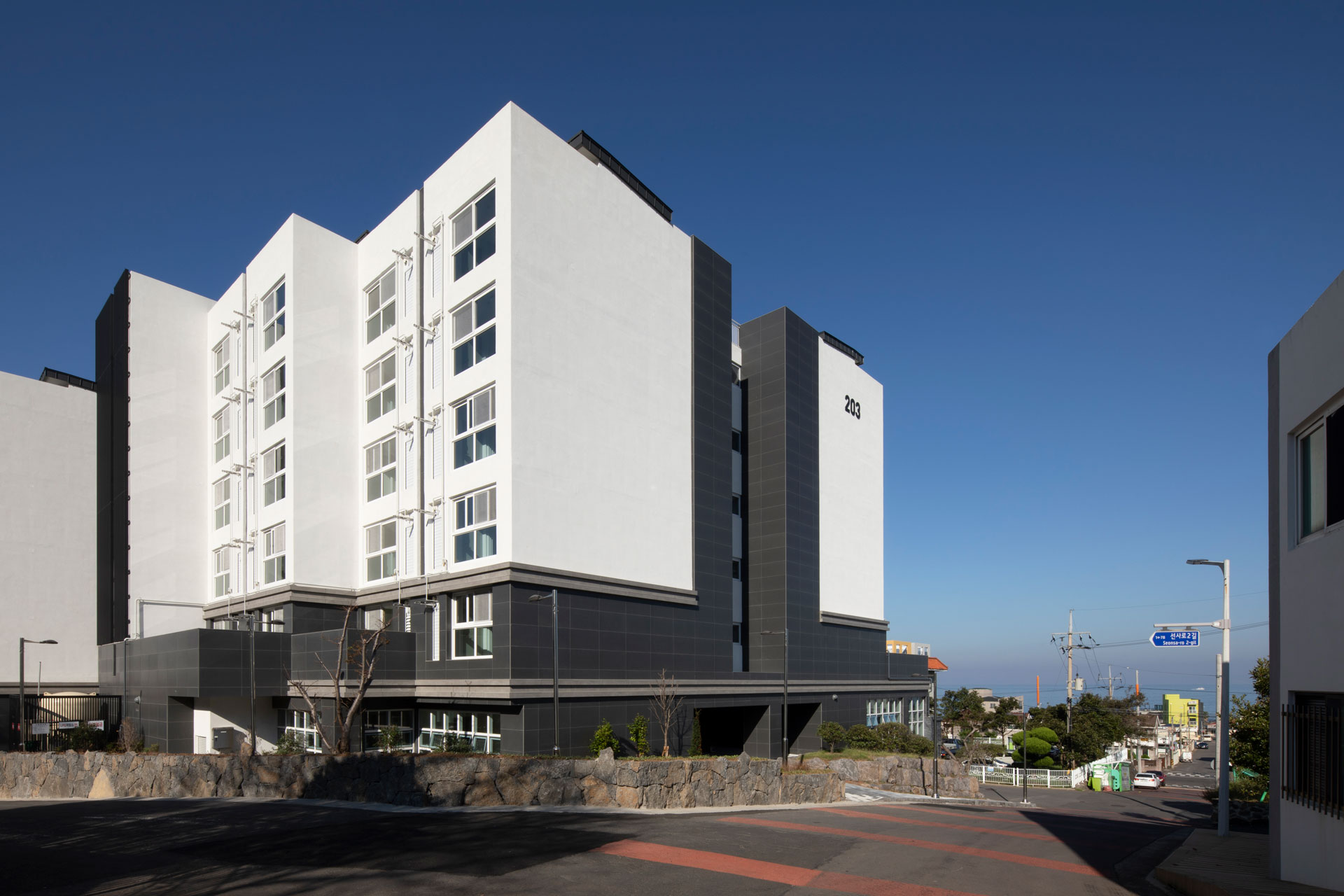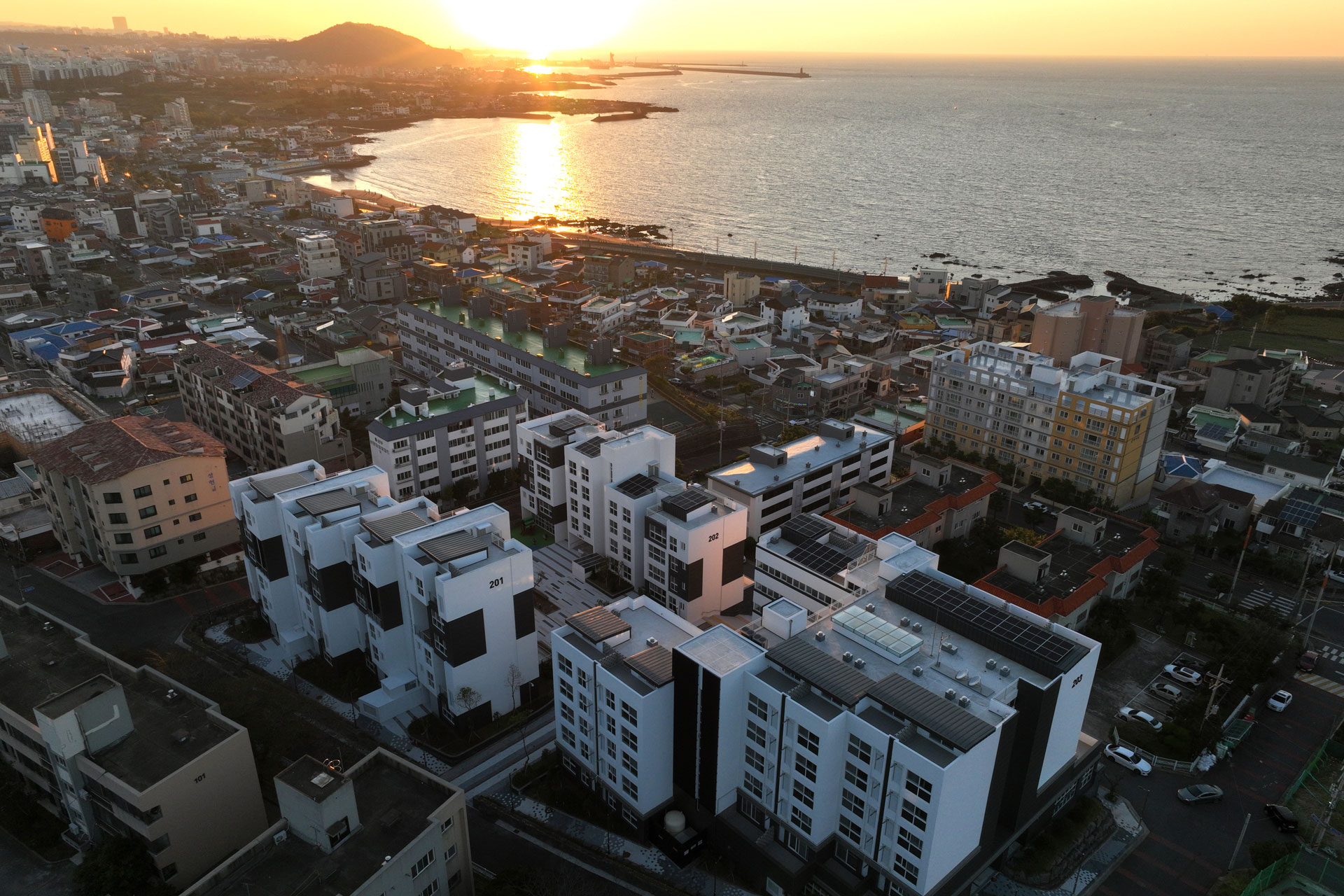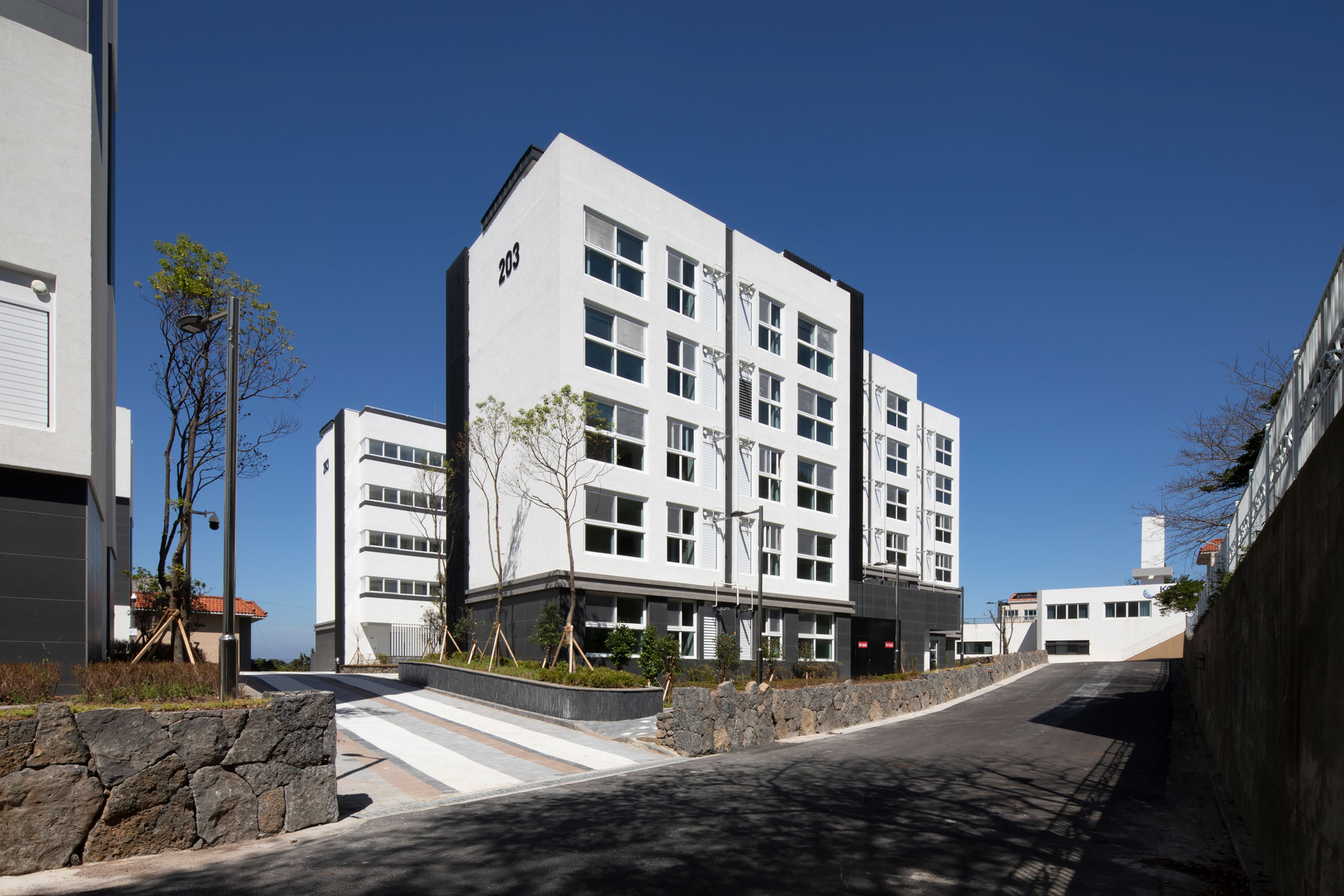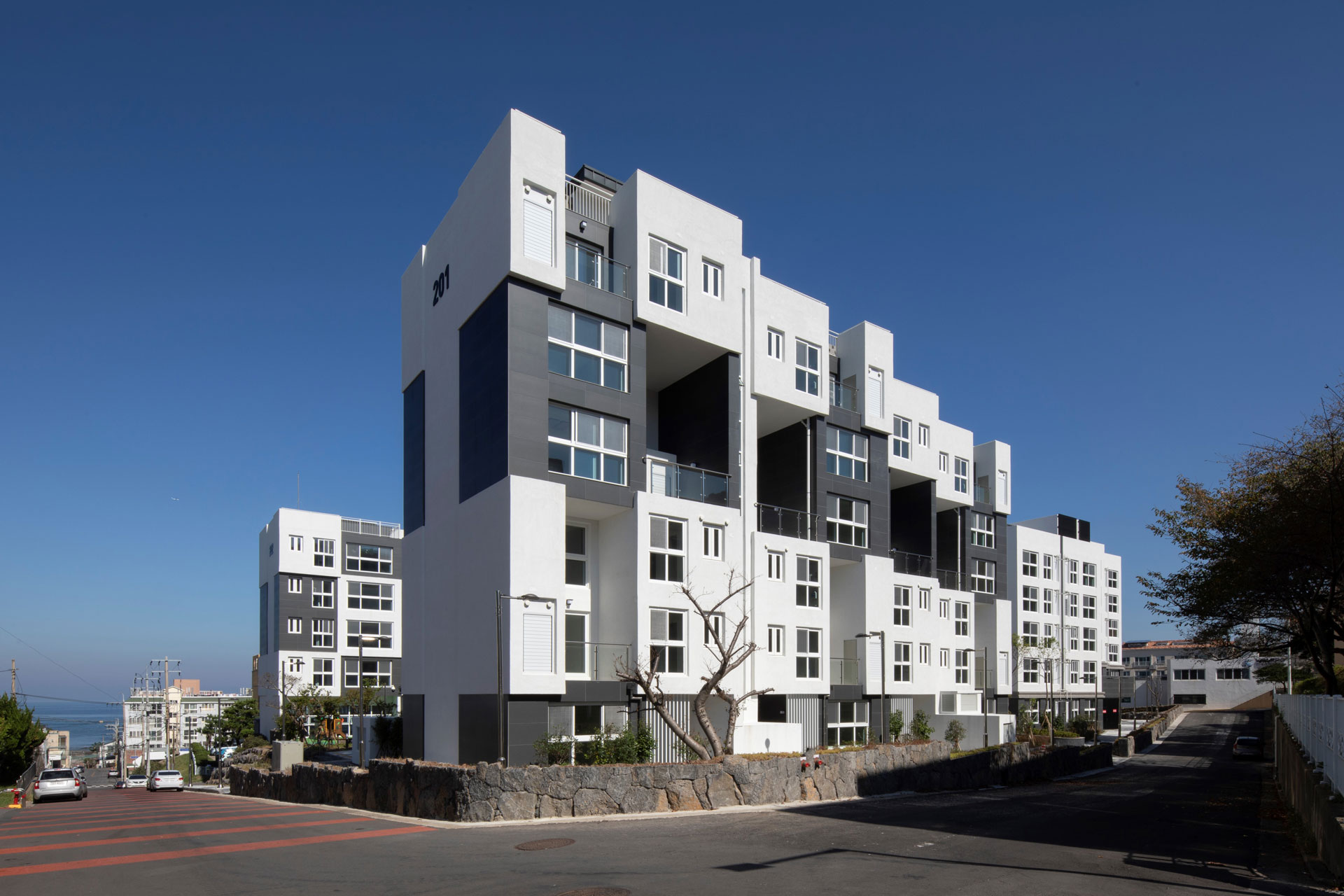 단지 마스터플랜에서는 제주도의 지역적 특성을 고려해 사택단지 앞 바다와 단지 뒤 오름을 조망할 수 있는 통경축으로 이들을 시각적으로 연결하며, 단지 내로 자연을 유입하고 연결하고 도시와 자연의 맥락을 담고자 했다. 고도제한 20m 내에서 최적의 볼륨을 형성한 뒤 창과 조망을 고려해 두 개 축을 중심으로 나누었다. 매스의 분절과 돌출로 다양한 주거유형을 반영해 중부발전 직원들의 수요와 제주의 주변환경에 대응한다. 평형별 특성에 맞는 기본 주거 유형에 테라스 하우스, 복층형 주거, 저층세대 직출입, 최상층 다락방 등 특화 공간을 구성해 직원 거주자의 라이프스타일을 고려한 주거 유형을 다양하게 제안했다.