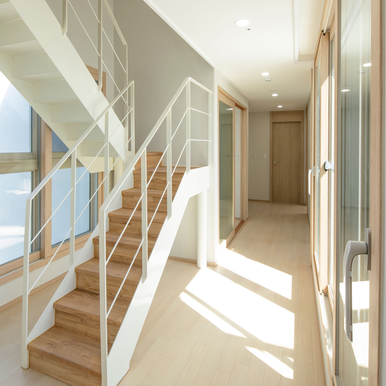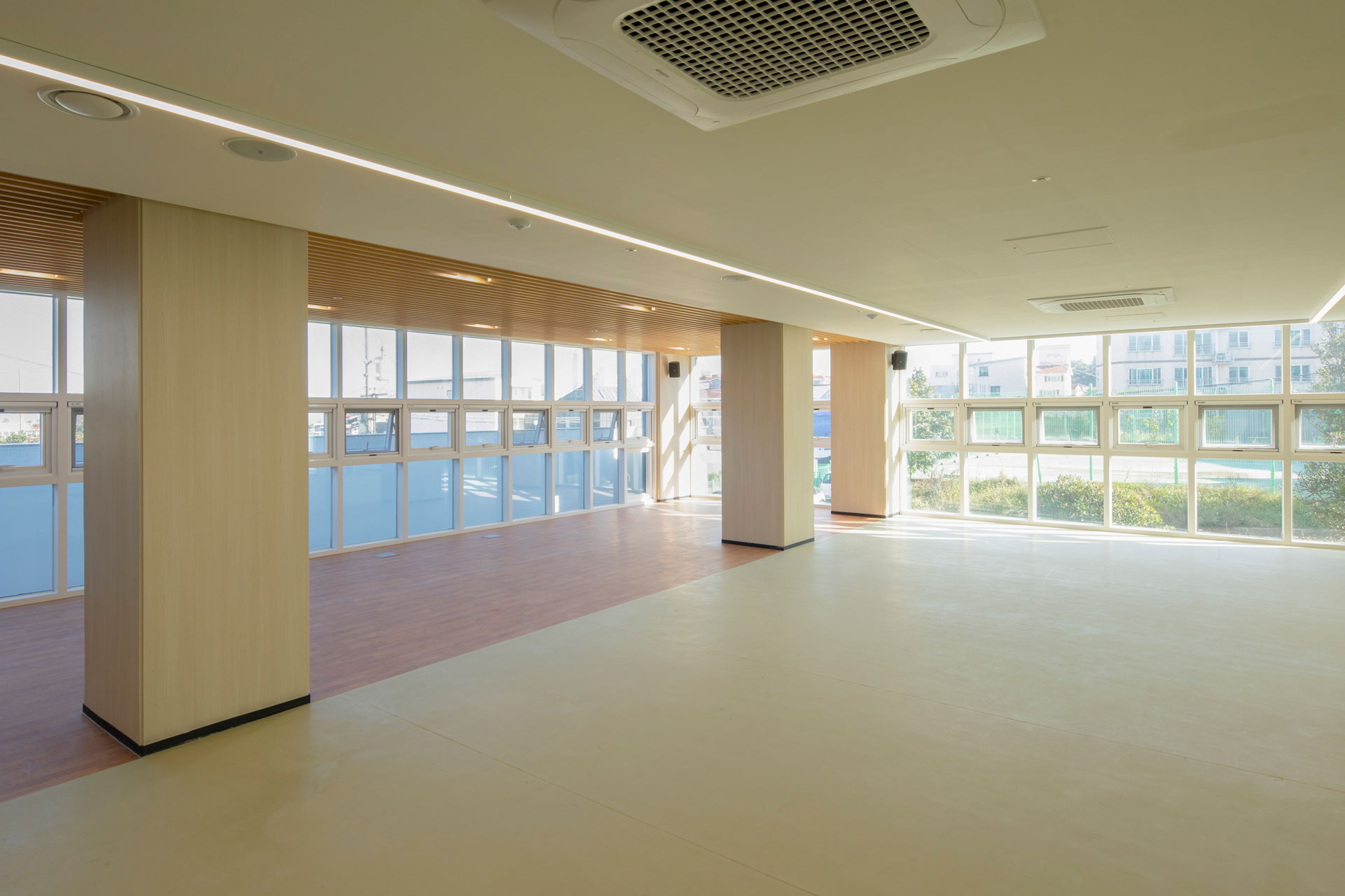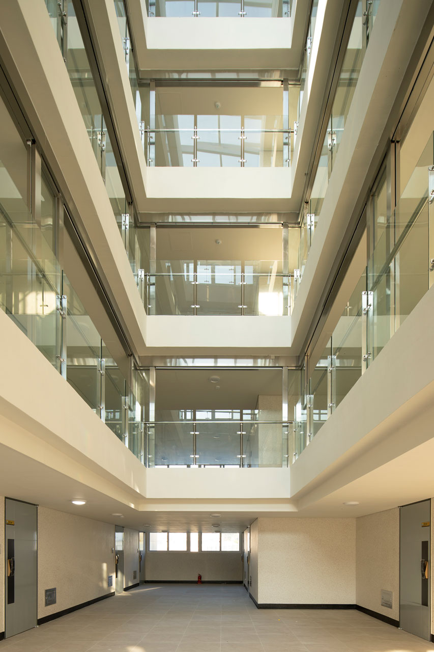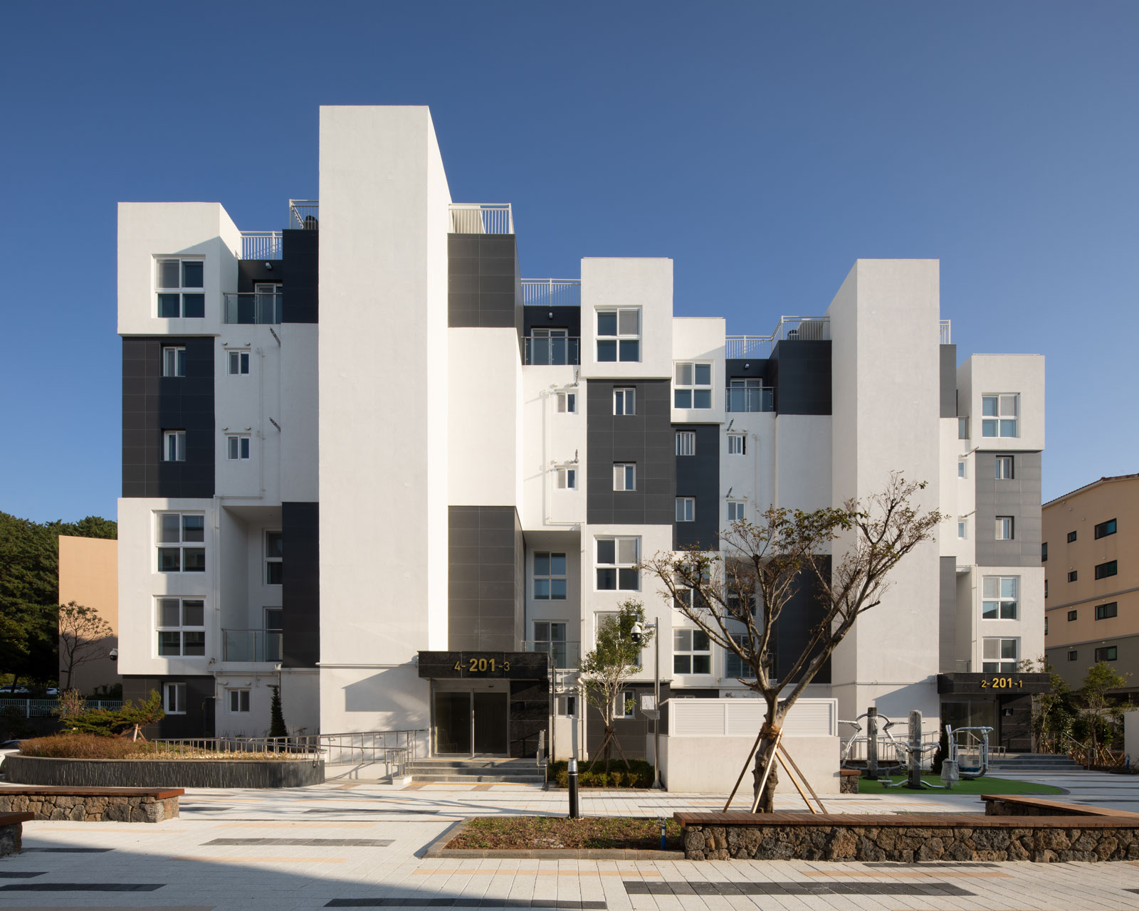 단지 마스터플랜에서는 제주도의 지역적 특성을 고려해 사택단지 앞 바다와 단지 뒤 오름을 조망할 수 있는 통경축으로 이들을 시각적으로 연결하며, 단지 내로 자연을 유입하고 연결하고 도시와 자연의 맥락을 담고자 했다. 고도제한 20m 내에서 최적의 볼륨을 형성한 뒤 창과 조망을 고려해 두 개 축을 중심으로 나누었다. 매스의 분절과 돌출로 다양한 주거유형을 반영해 중부발전 직원들의 수요와 제주의 주변환경에 대응한다. 평형별 특성에 맞는 기본 주거 유형에 테라스 하우스, 복층형 주거, 저층세대 직출입, 최상층 다락방 등 특화 공간을 구성해 직원 거주자의 라이프스타일을 고려한 주거 유형을 다양하게 제안했다.