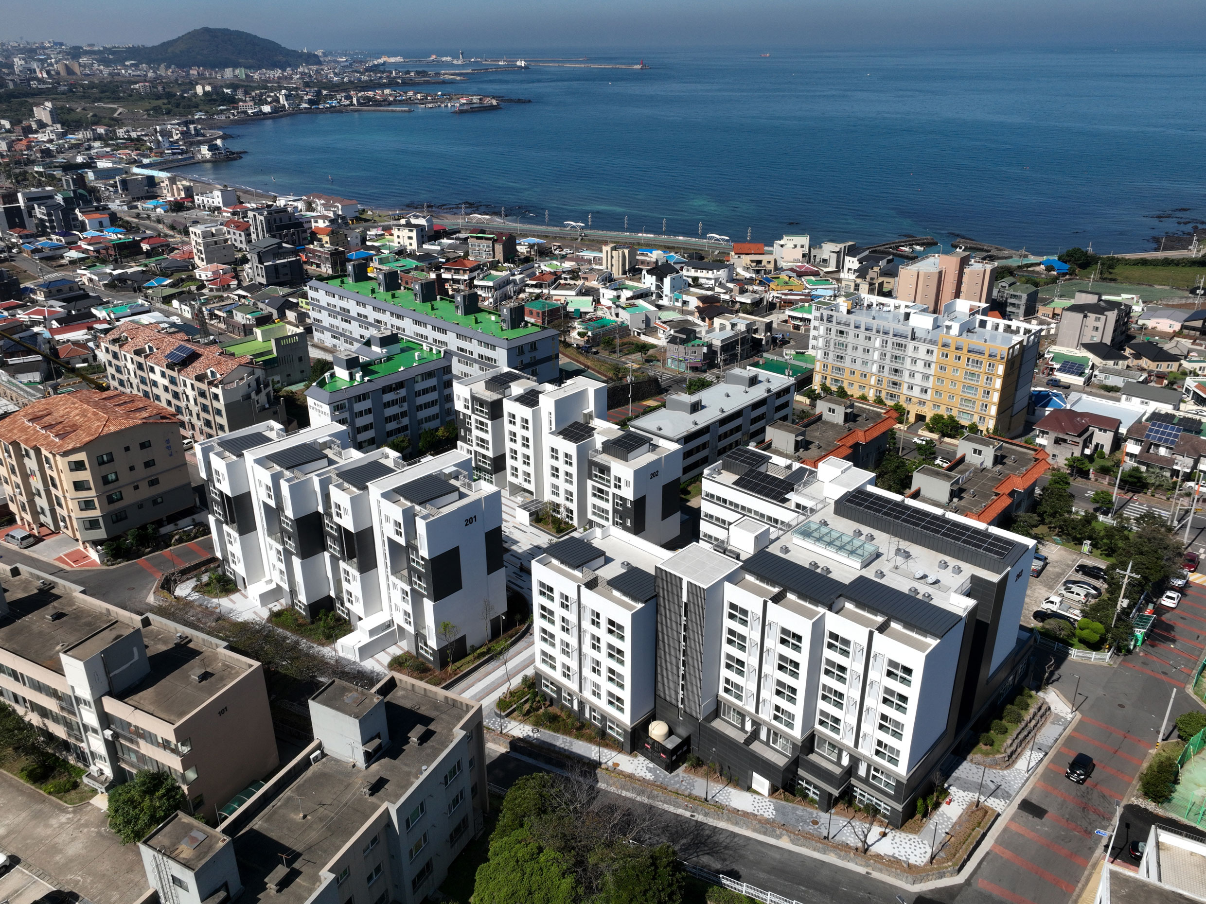 단지 마스터플랜에서는 제주도의 지역적 특성을 고려해 사택단지 앞 바다와 단지 뒤 오름을 조망할 수 있는 통경축으로 이들을 시각적으로 연결하며, 단지 내로 자연을 유입하고 연결하고 도시와 자연의 맥락을 담고자 했다. 고도제한 20m 내에서 최적의 볼륨을 형성한 뒤 창과 조망을 고려해 두 개 축을 중심으로 나누었다. 매스의 분절과 돌출로 다양한 주거유형을 반영해 중부발전 직원들의 수요와 제주의 주변환경에 대응한다. 평형별 특성에 맞는 기본 주거 유형에 테라스 하우스, 복층형 주거, 저층세대 직출입, 최상층 다락방 등 특화 공간을 구성해 직원 거주자의 라이프스타일을 고려한 주거 유형을 다양하게 제안했다.