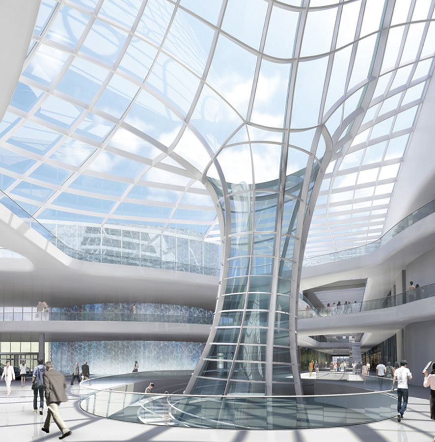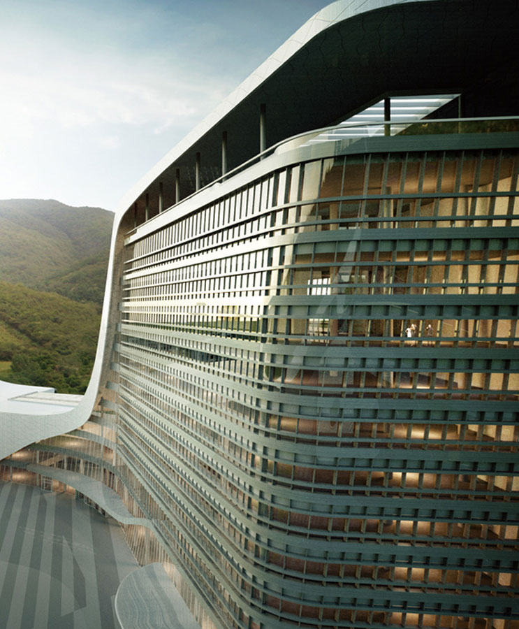 땅의 에너지를 모아 솟아오르다 대지는 토함산의 줄기가 동쪽에서 두 줄기의 대종천과 마주치는 지점으로 석굴암에서 대종천을 지나 동해로 이어지는 일직선상에 위치한다. 15m 이상의 높이 차가 있는 서쪽의 둔덕과 남북으로 긴 삼각지인 독특한 자연지형은 배치에 그대로 반영되었고, 볼륨은 토함산의 에너지를 안고 동해로 비상하는 이미지로 형상화되었다. 경주 도심에서도 30분 이상 거리가 있는 외진 곳으로, 이제는 일과의 대부분을 사옥과 인근에서 해결해야 하는 도시생활에 익숙한 직원들을 위해 도심형 스트리트 몰 개념의 복지시설과 대종천변에서 둔덕을 이용한 친환경테마공원으로 이어지는 순환이 가능한 산책로와 근린공원을 계획했다. 또한 주변으로 근린시설, 교육시설, 주거시설을 계획하여 마스터플랜의 비전을 함께 제시했다.