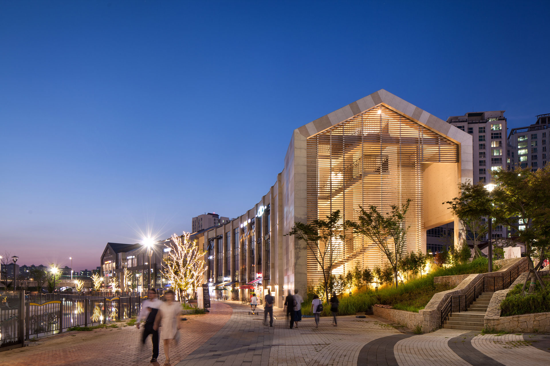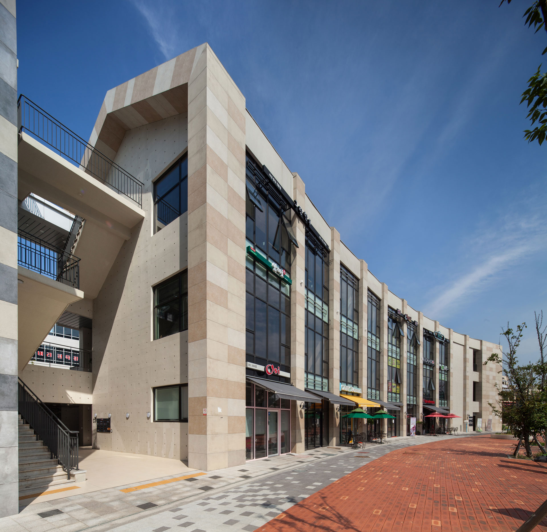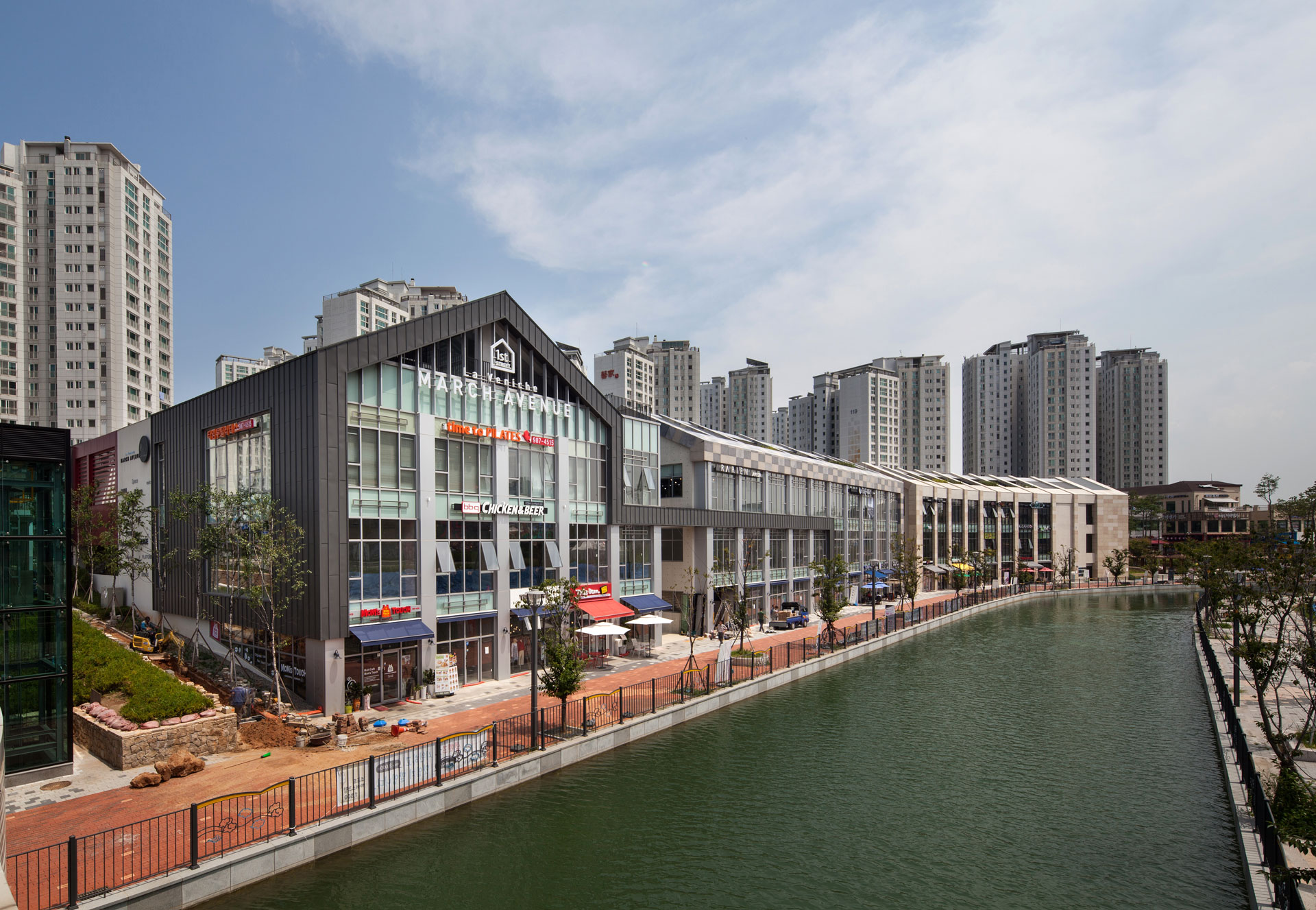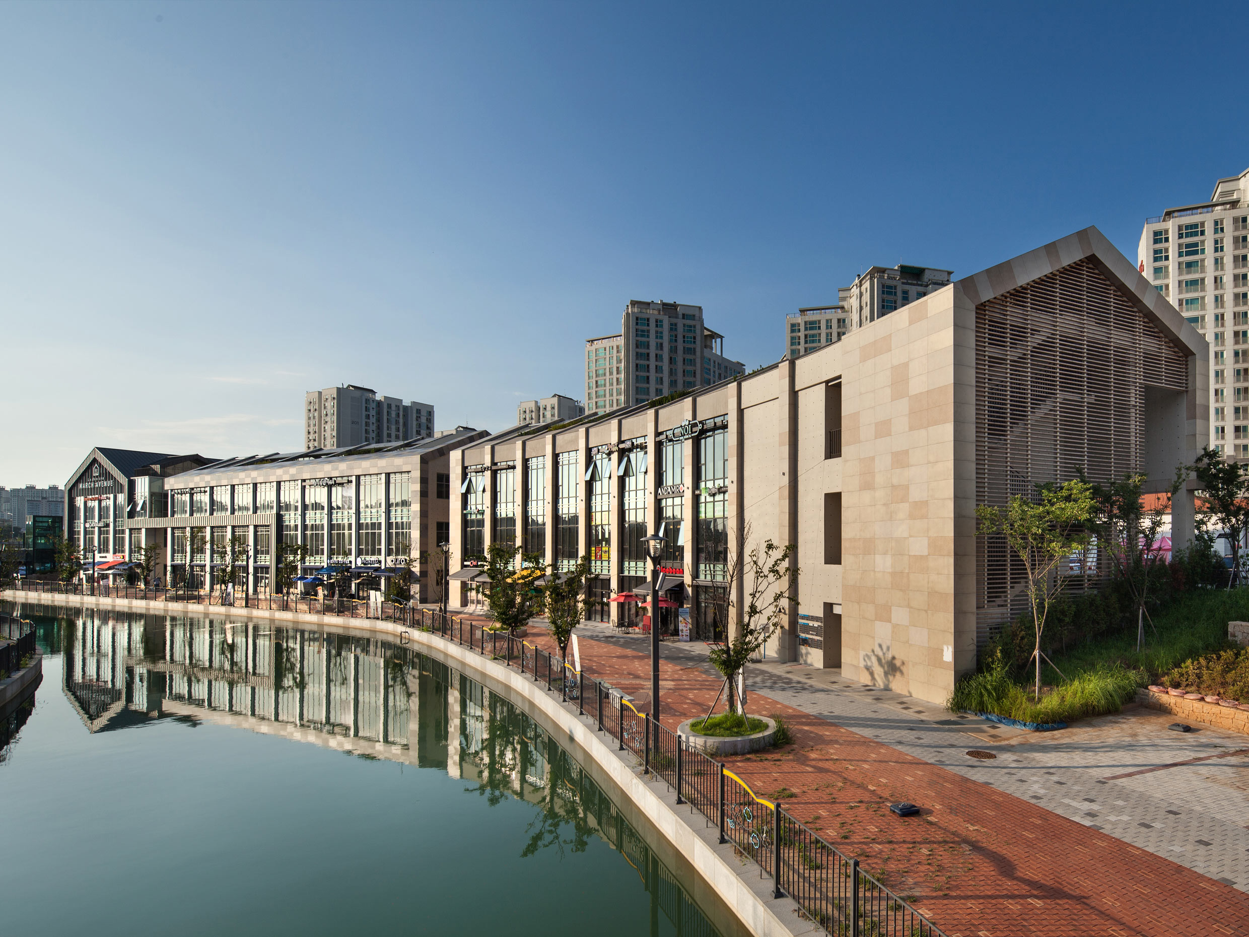 길게 늘어진 건물 사이에 적절히 녹지 공간을 계획하고, 상업 공간을 블록별로 묶고 있다. 수로 변과 블록 뒤편의 도시를 잇는 흐름을 고려해 공간을 일부 비워내기도 했다. 건물과 수변 데크 등 보행로 레벨을 입체적으로 계획하고, 수로 변에는 테라스형 상업 공간을 확보하면서 리듬 있는 공간 배치로 흥미로운 가로환경을 연출했다. 대지 후면에는 선큰가든을 두어 수로변으로 보행자 접근이 원활하도록 유도했다. 계획 대지 중앙부에는 특화된 프로그램의 상업시설을 계획하여 전체 블록에서 앵커 역할을 할 수 있도록 계획했다.