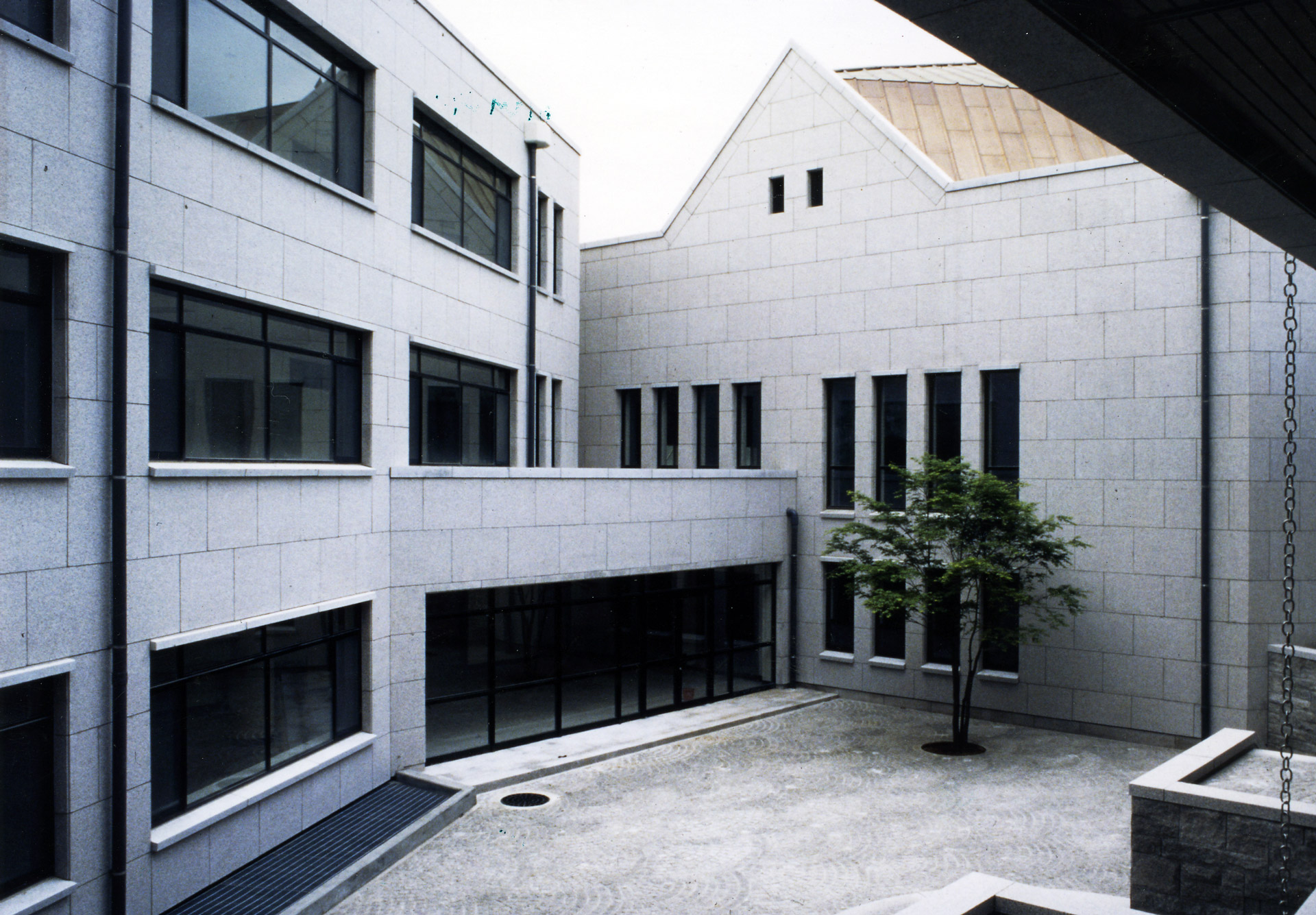 중앙도서관 옆 경사진 지형에 순응하는 배치계획과 캠퍼스내 기존 콘텍스트를 고려한 화강석 외벽과 동판의 경사 지붕은 풍부한 조형성을 표현하고 있다.