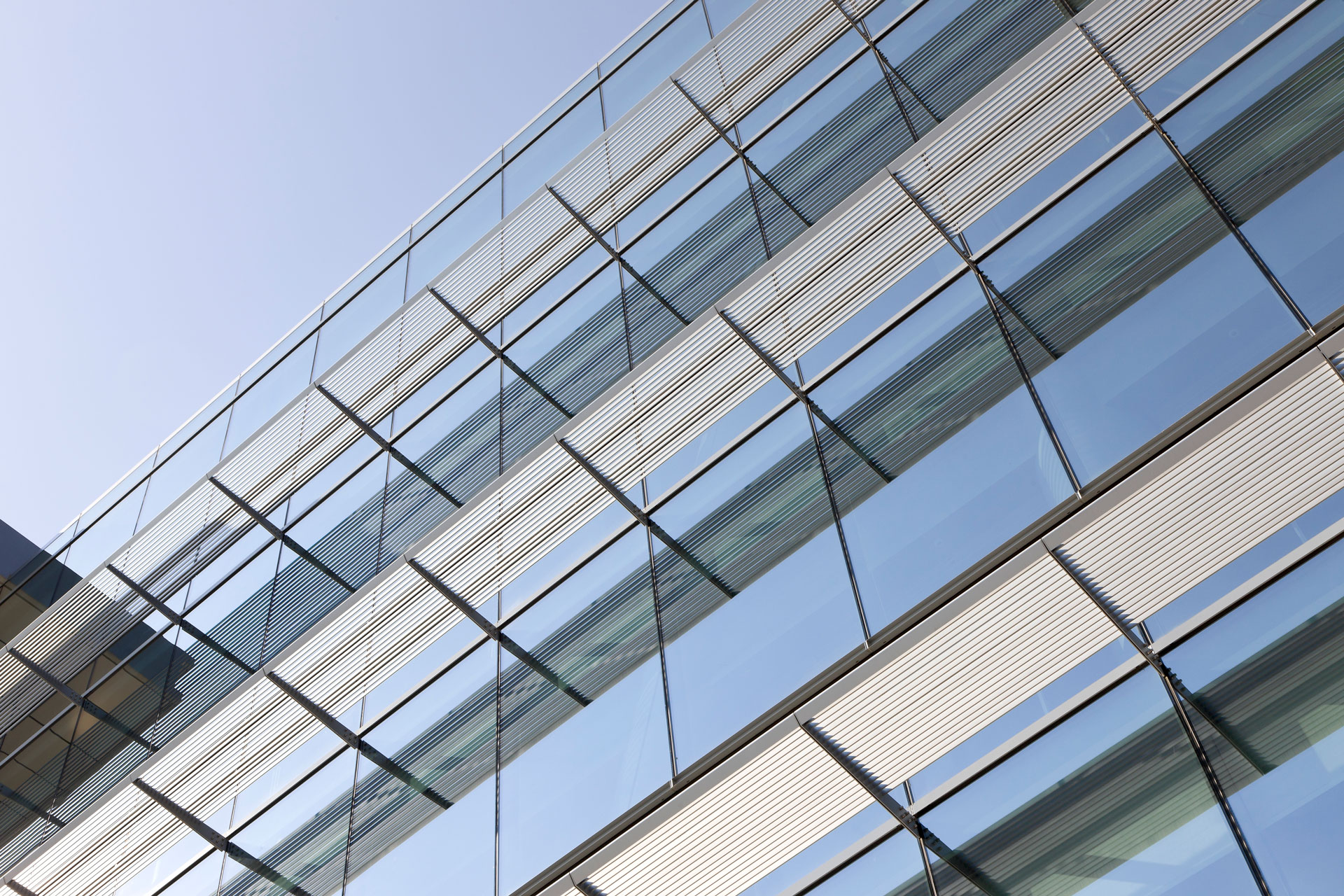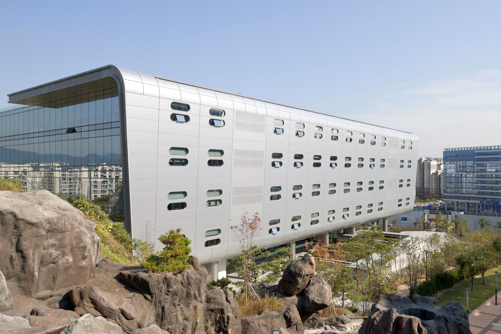 매스는 단순한 육면체 형태이나 사면과 위아래로 각기 다른 조형언어를 갖고 있다. 이는 보행로, 고속화도로, 인접대지, 근린공원과 하늘까지 대지를 둘러싸고 있는 서로 다른 콘텍스트에 각 면이 명확하게 조응하기 위함이다. 남측 유리면은 연구 공간에 자연광을 최대한으로 유입시키는 한편 좌우면을 둘러싼 외피는 동서측에서 발생되는 소음과 일사량을 조절하면서 첨단 연구 시설 건물에 속도감 있는 상징성을 부여한다.