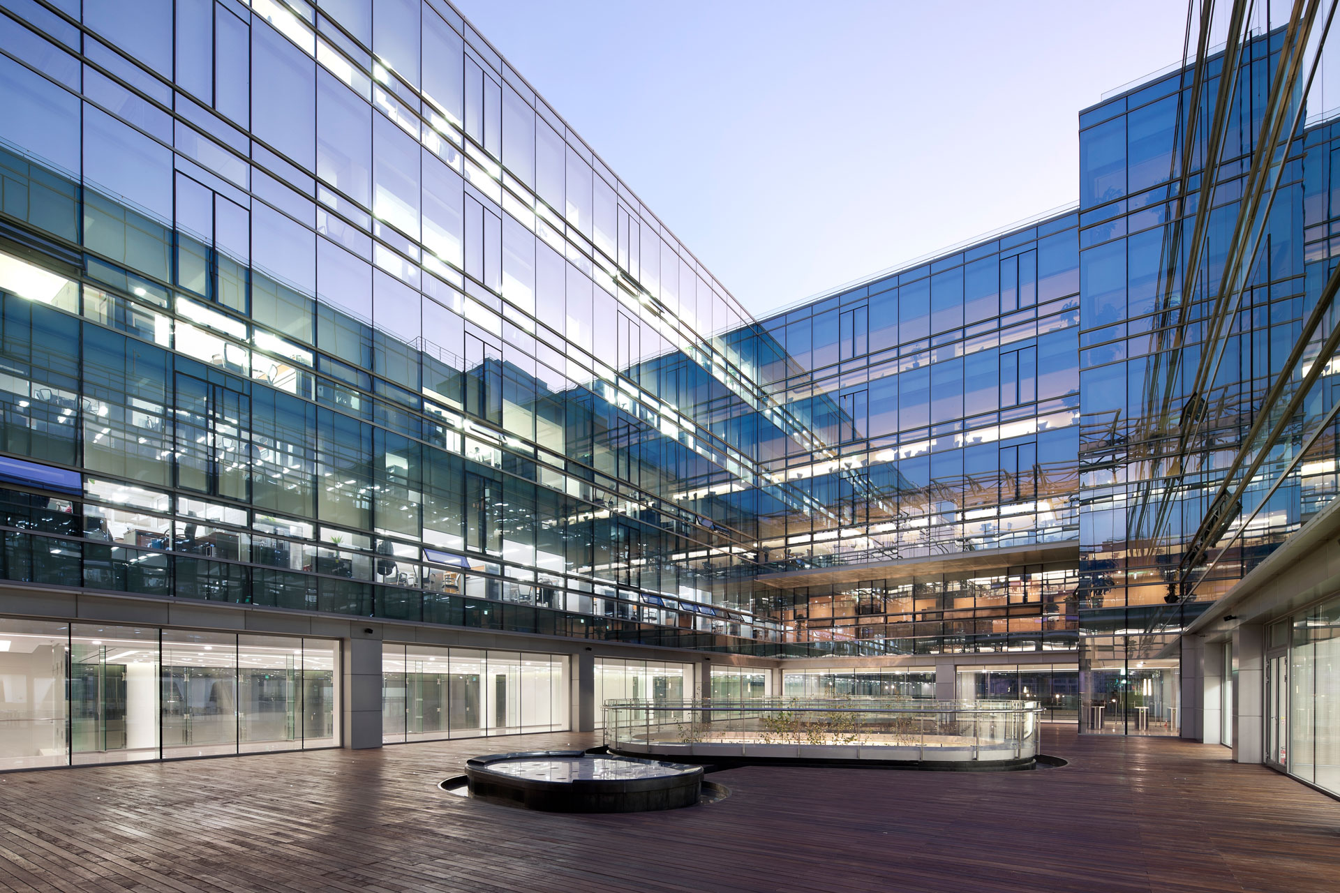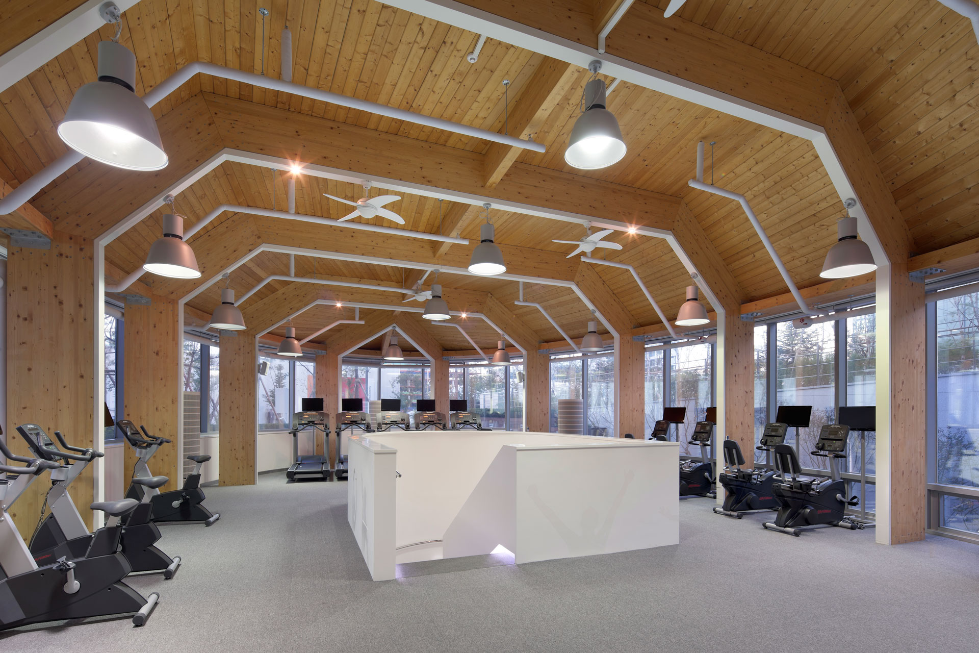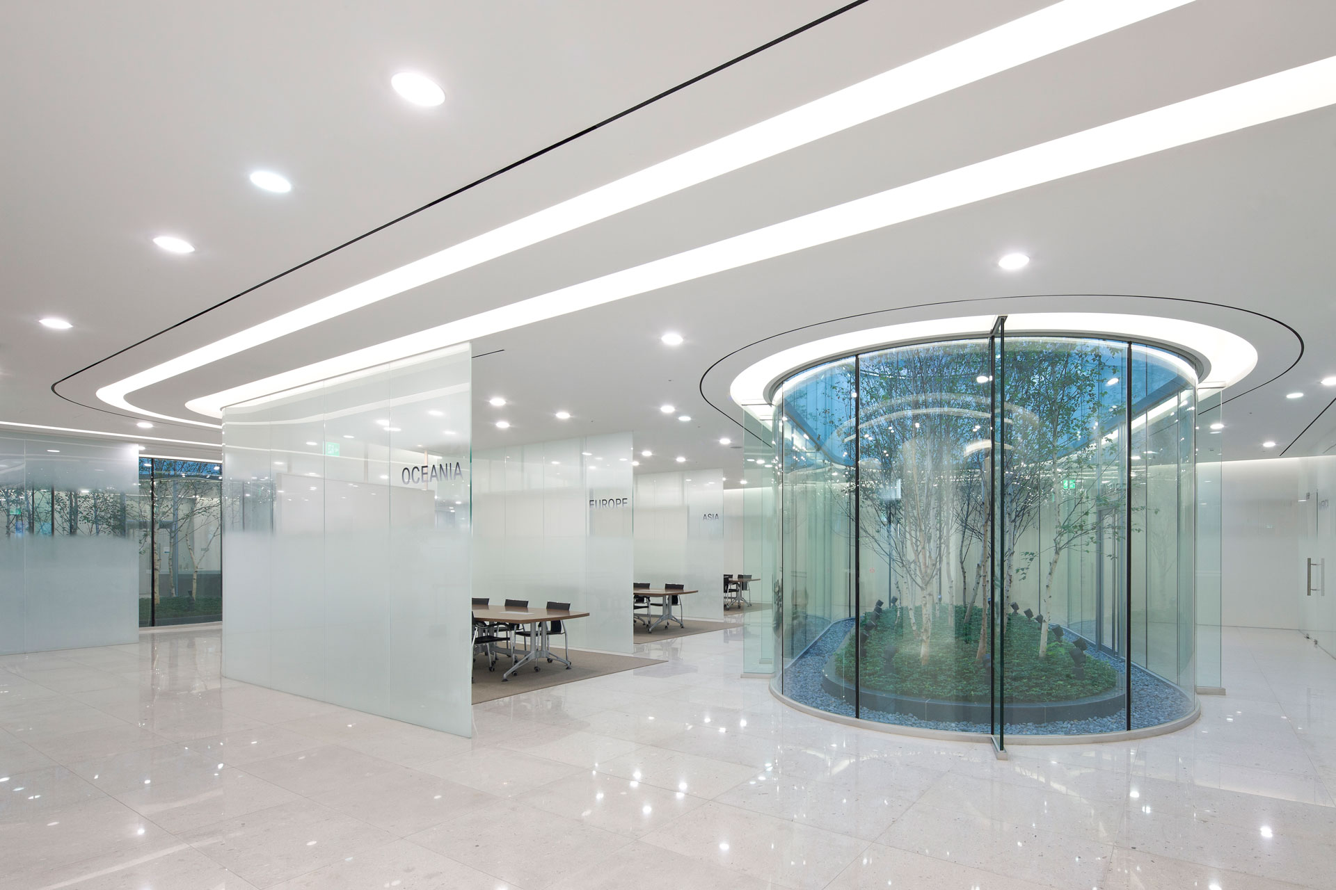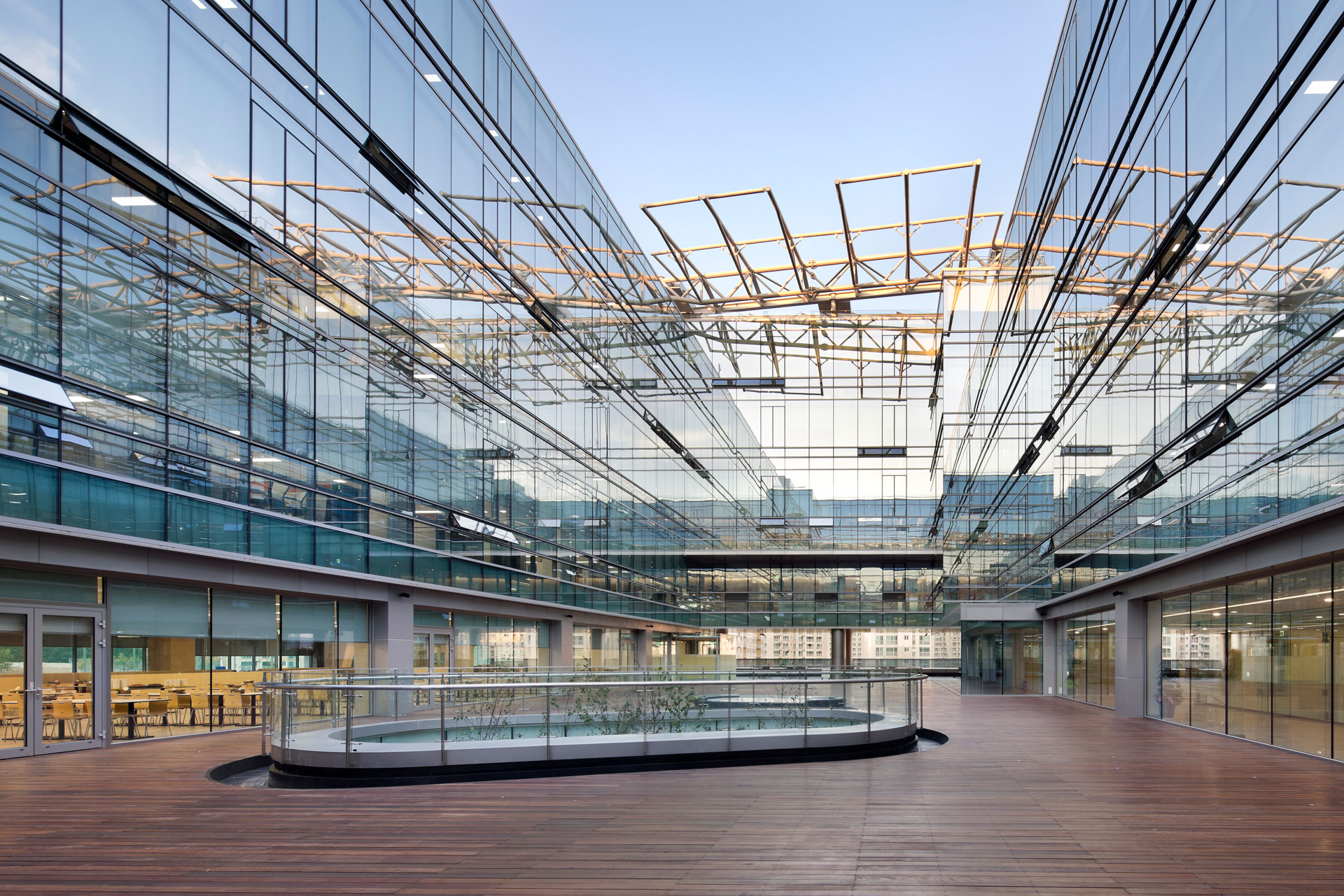 전면의 조경 공간은 광장을 출입구로 끌어들이고, 건물 내 가장 공적인 영역이자 맑고 투명한 로비 공간이 방문객을 빠르게 유입시키며 다양한 기능이 섞이는 광장의 개념을 연장해 온다. 전면 진입 광장에 놓인 피트니스동과 홍보관은 오브제처럼 놓여 있으며, 서측 선큰 광장이 피트니스 건물동 및 지하 지원시설에 자연 환기와 빛을 제공한다. 연구시설에는 매우 효율적인 평면과 단면이 요구됨에 따라 수직적으로 조닝된 공간 기능들은 연구소의 보안 설정에 부합하면서도, 주변의 미묘한 변화들이 기능 설정과 감성적 표현에 큰 영향을 주었다. 근두운 마당으로 명명된 2층 중정은 1층 방문자 영역과 상부 연구 영역을 분리하면서 시각적인 개방감과 심리적 연결을 제공해 연구원들의 커뮤니케이션 공간이 된다.