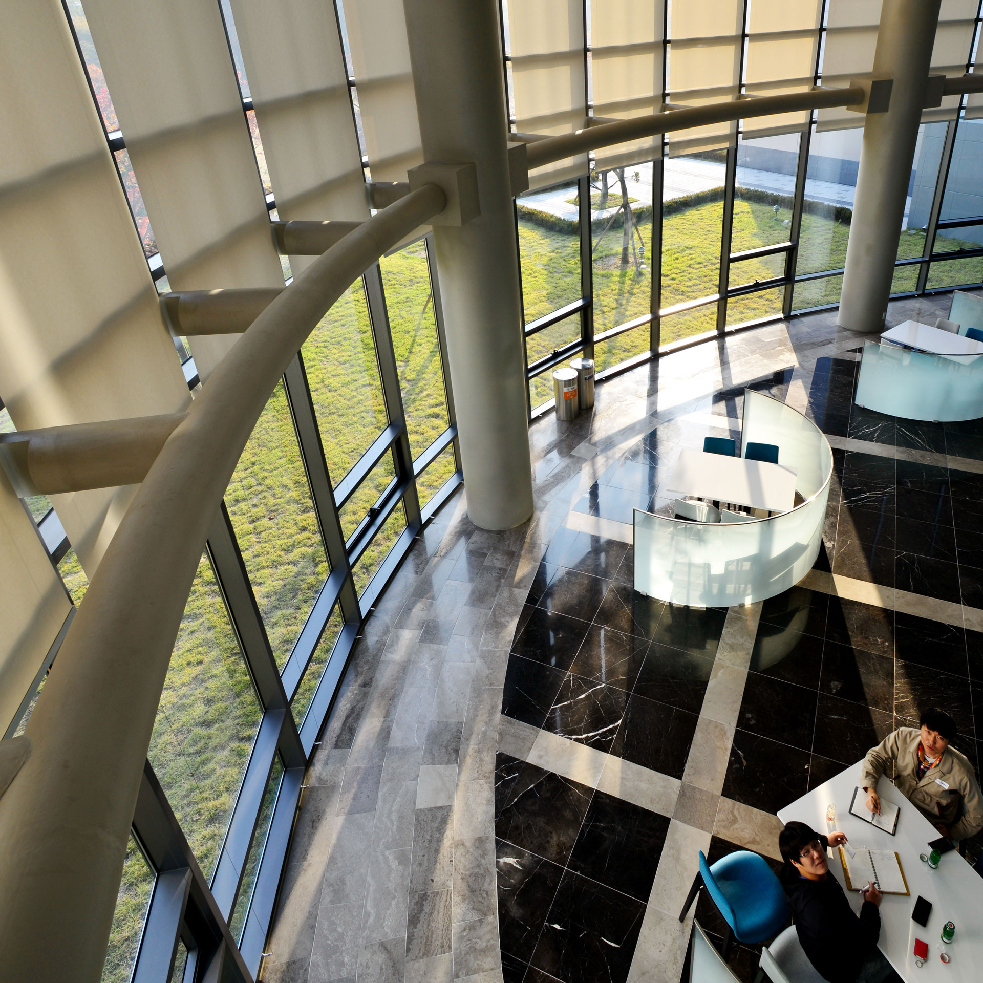 이렇게 기능에 따라 분절된 기존 연구동, 사무동, 실험동, 대강당의 매스는 타원형의 Consilience Space에 의해 연결된다. 석유화학을 상징하는 타원형의 Consilience Tank는 최근 교육연구시설의 화두인 통섭의 주제를 담은 공간으로 증축에 의한 축의 이동과 정면성에 대응하고 있으며, 로비, 수직 동선, 접견실, 회의실 등 공유할 수 있는 프로그램을 담아 교류를 유도하고자 했다.