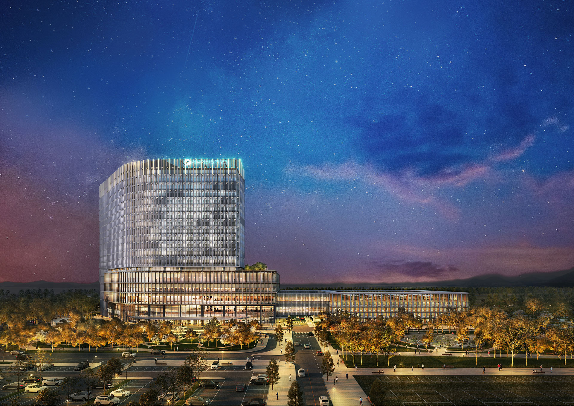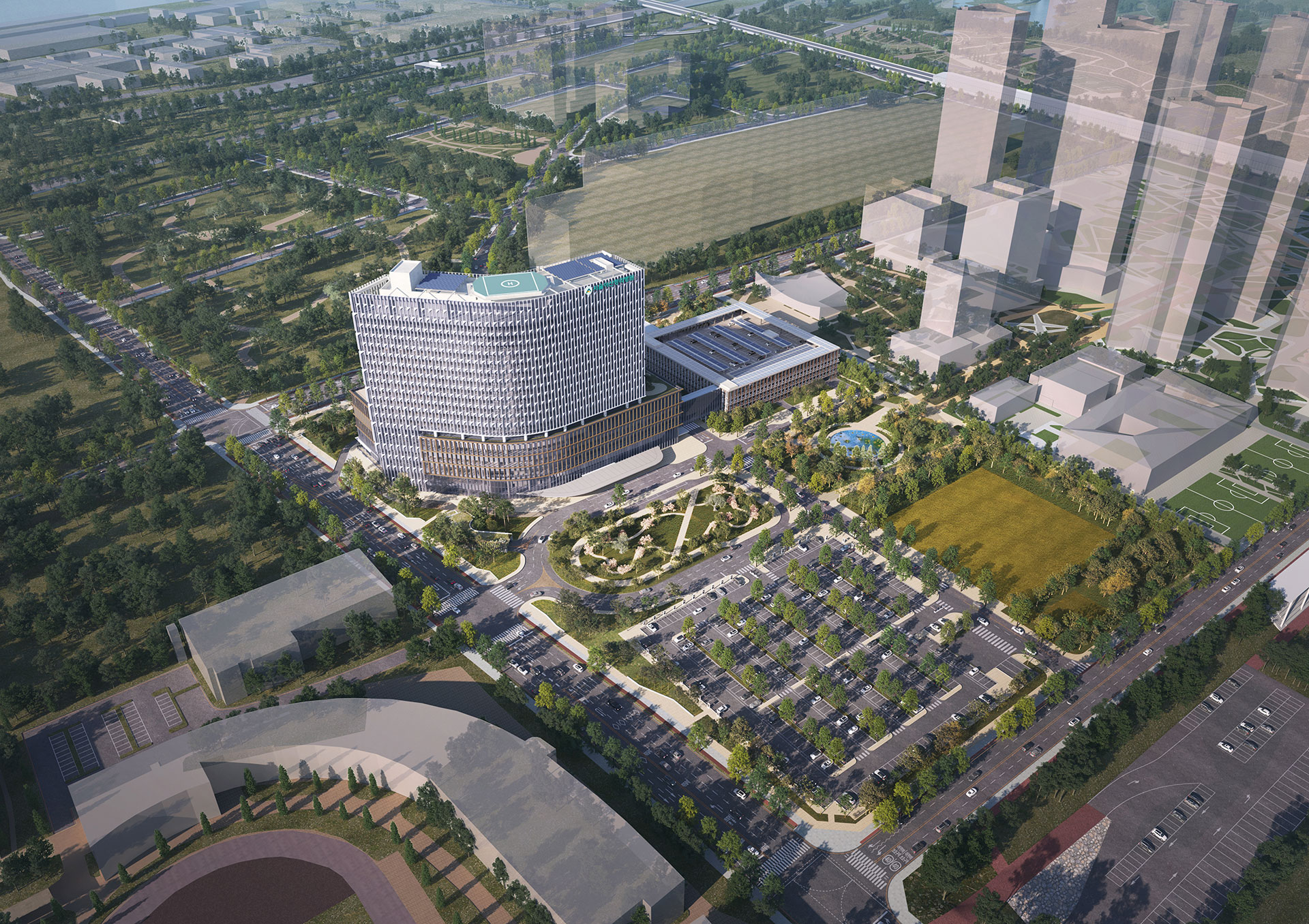 서울아산청라병원은 인천 청라신도시를 대표하는 랜드마크로, ‘국제 표준 병원(Global Standard Hospital)’을 목표로 병원건축의 새로운 기준을 제시하고자 한다. 청라병원의 마스터플랜은 최종 1,000병상 종합병원과 교육·연구시설, 기숙사가 포함된 국제 의료 클러스터로 확장될 예정으로, 단지 내 KAIST와 하버드 의대 MGH 연구소 등 글로벌 연구기관을 유치하며 의료·바이오 연구와 교육을 결합한 세계적 수준의 허브를 완성한다. 마스터플랜에 기반한 이번 1단계에서는 800병상 규모의 종합병원과 주차동을 조성한다.