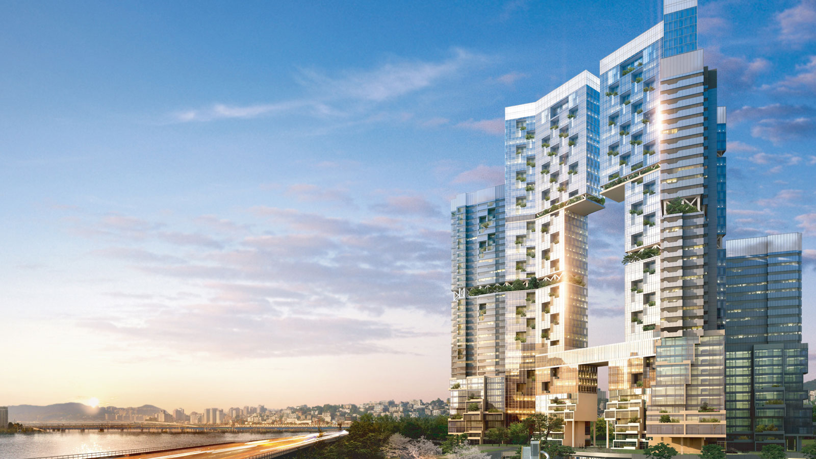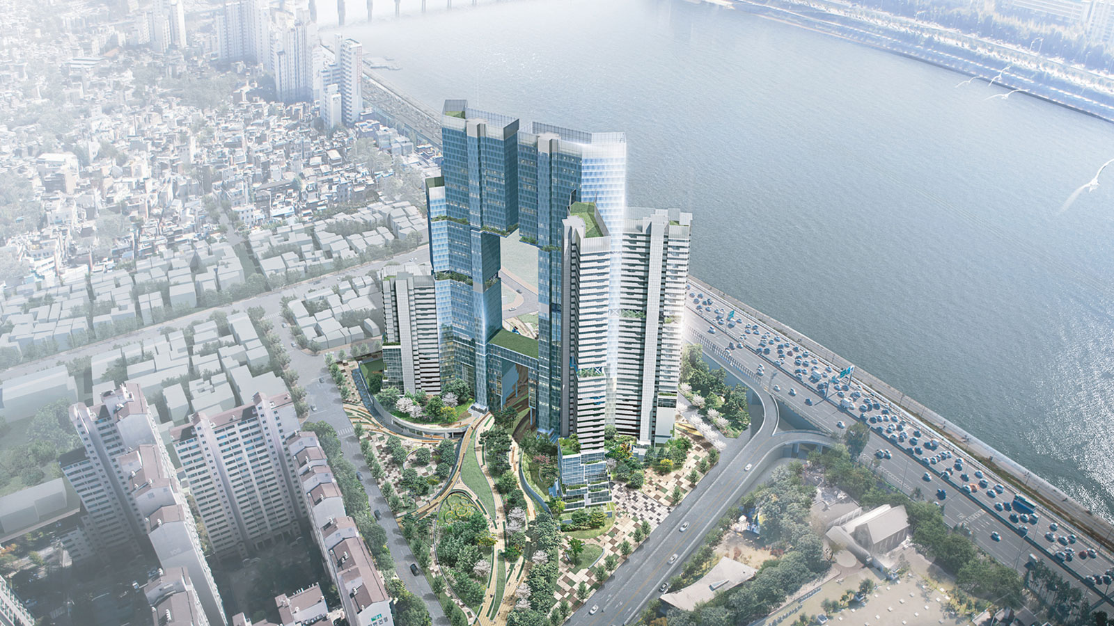 대지는 남쪽으로 도시의 여백을 만드는 주체인 한강과 서쪽으로 도시의 여유를 만드는 서울숲의 녹지를 연결하는 길목에 위치해 있다. 도시적으로는 강북의 새로운 스카이라인을 만들고 있고, 갤러리아포레와 뚝섬 편한세상이 인접해 있으며 강변북로가 남쪽으로 위치해 있다. 이곳에 지어야 하는 것은 한강과 서울숲의 흐름을 자연스럽게 대지 내로 삽입시킨 자연친화적 주거이며, 강북의 새로운 아이콘이 되어야 할 것이다. 계획안은 서울숲과 한강이라는 장소에 사람이 상시 거주하는 집이어야 한다는 개념에서 시작하였다. 집이라는 거주성의 관점에서 100% 남향, 맞통풍, 자연환기를 가능하게 하였고 한강과 서울숲이라는 장소성의 관점에서 전 세대 한강조망이 가능하도록 설계하였으며, 자연을 적극적으로 유입시켰다.