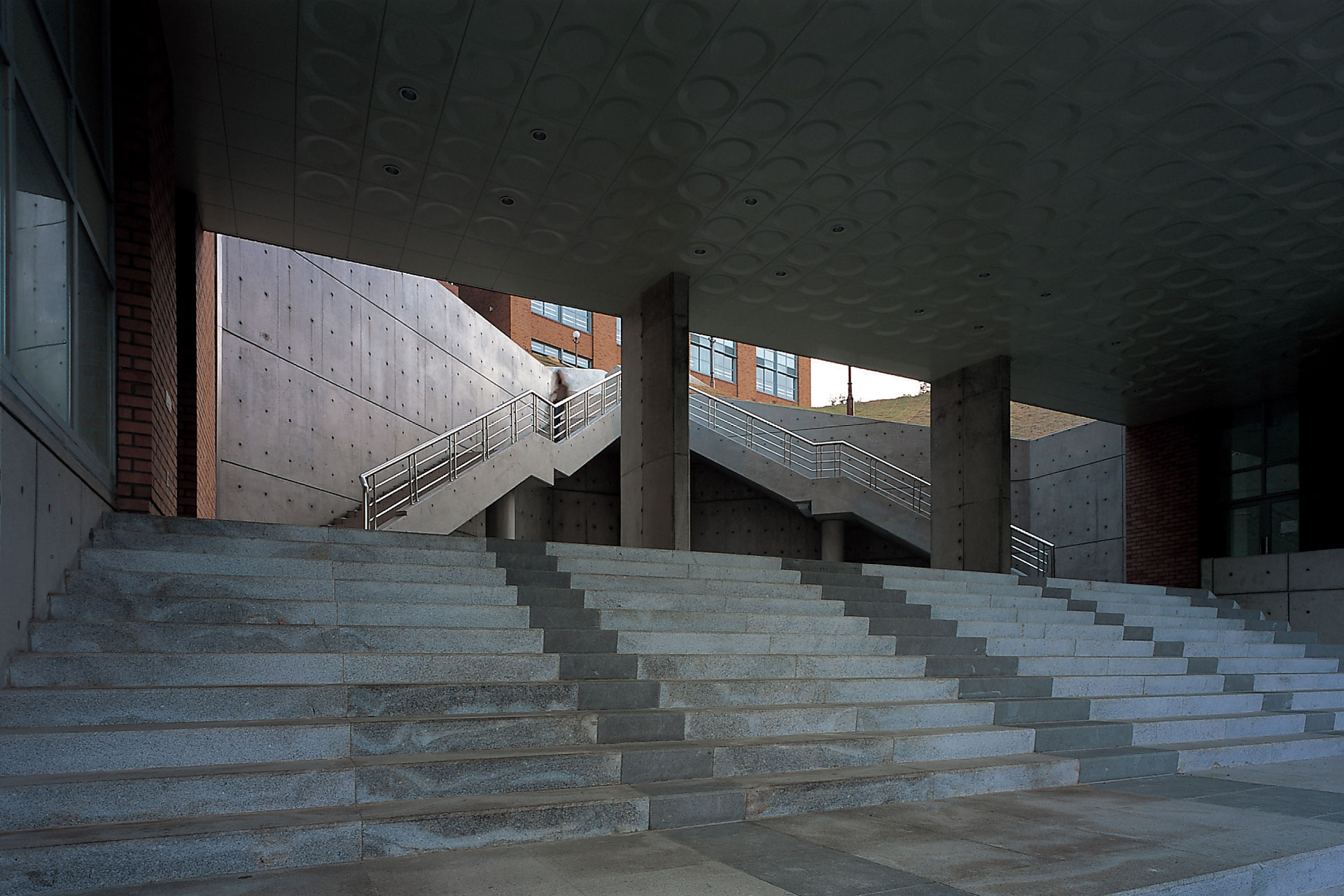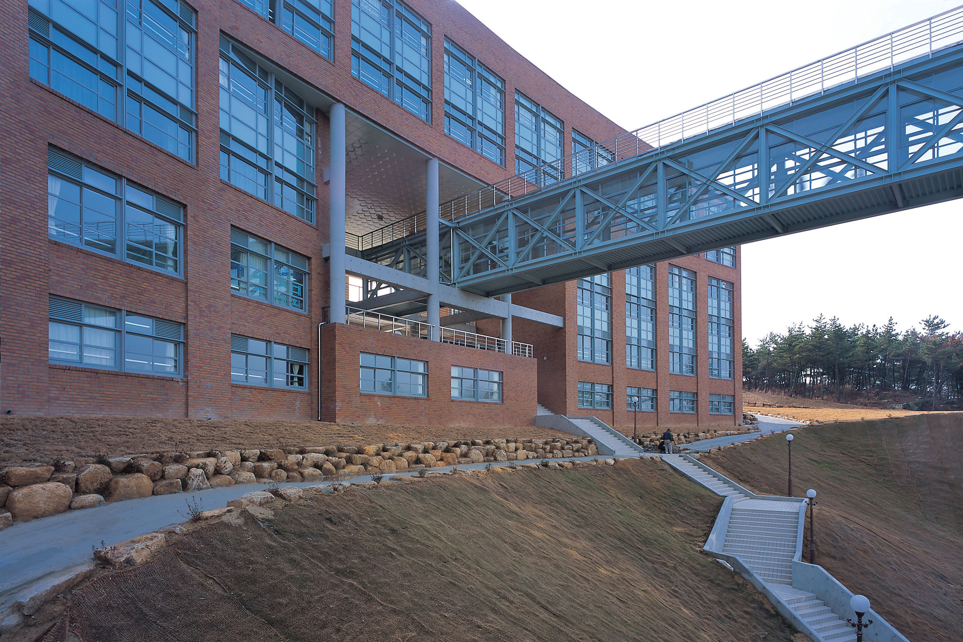 계획 부지는 대지 높이차가 20m에 달하는 급경사지였는데, 반복적인 도면 작업과 부지를 수차례 확인하는 답사를 거쳐 마스터플랜 계획 범위 내에서 지형을 최소한으로 변형하는 2개 부지를 조성할 수 있었다. 즉 기존 캠퍼스 흐름에 호응하는 하부 대지와, 신설 캠퍼스의 문턱을 알리는 주 매스가 들어설 상부 대지를 조성하면서 이들을 물리적이자 시각적으로 연결하는 계획을 구현할 수 있었다.